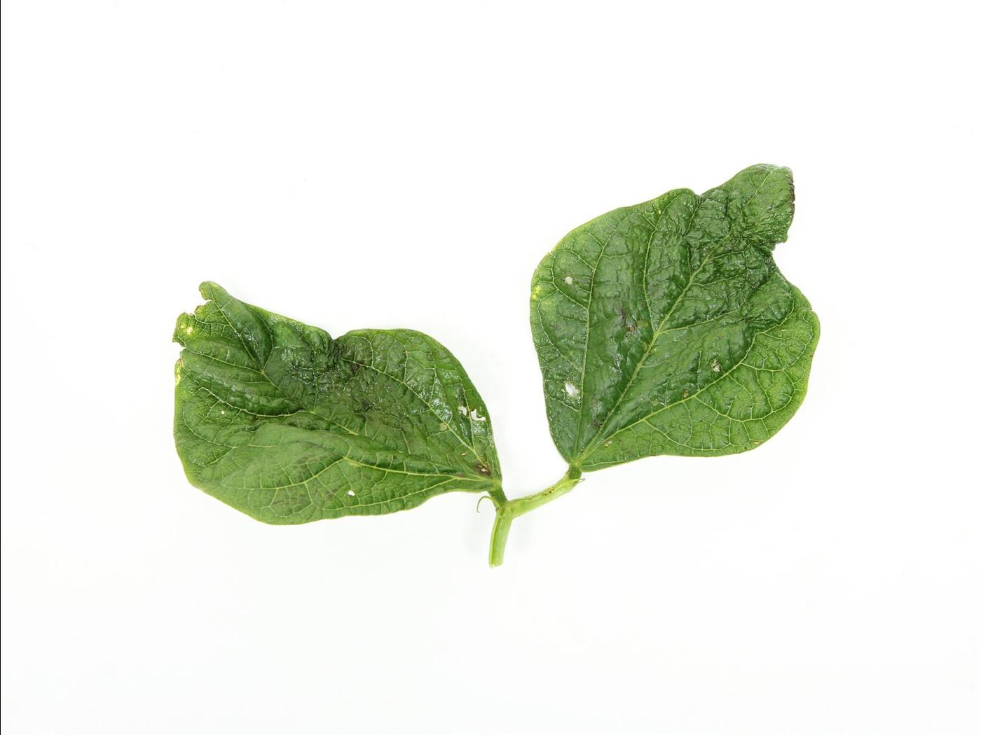 Description: Des folioles de haricot sont déformées et gaufrées. Seules les feuilles médianes sont affectées. Les tests de laboratoire ont révélé la présence du virus de la mosaïque du soya (SMV). Son hôte principal est le soya, mais il peut infecter certaines variétés de haricot.