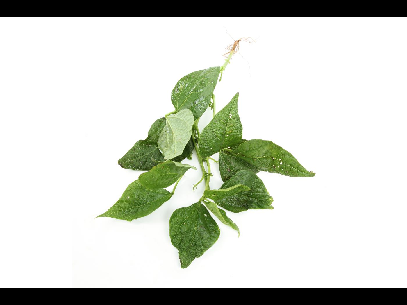Légende: Malformation des feuilles médianes d'un plant de haricot