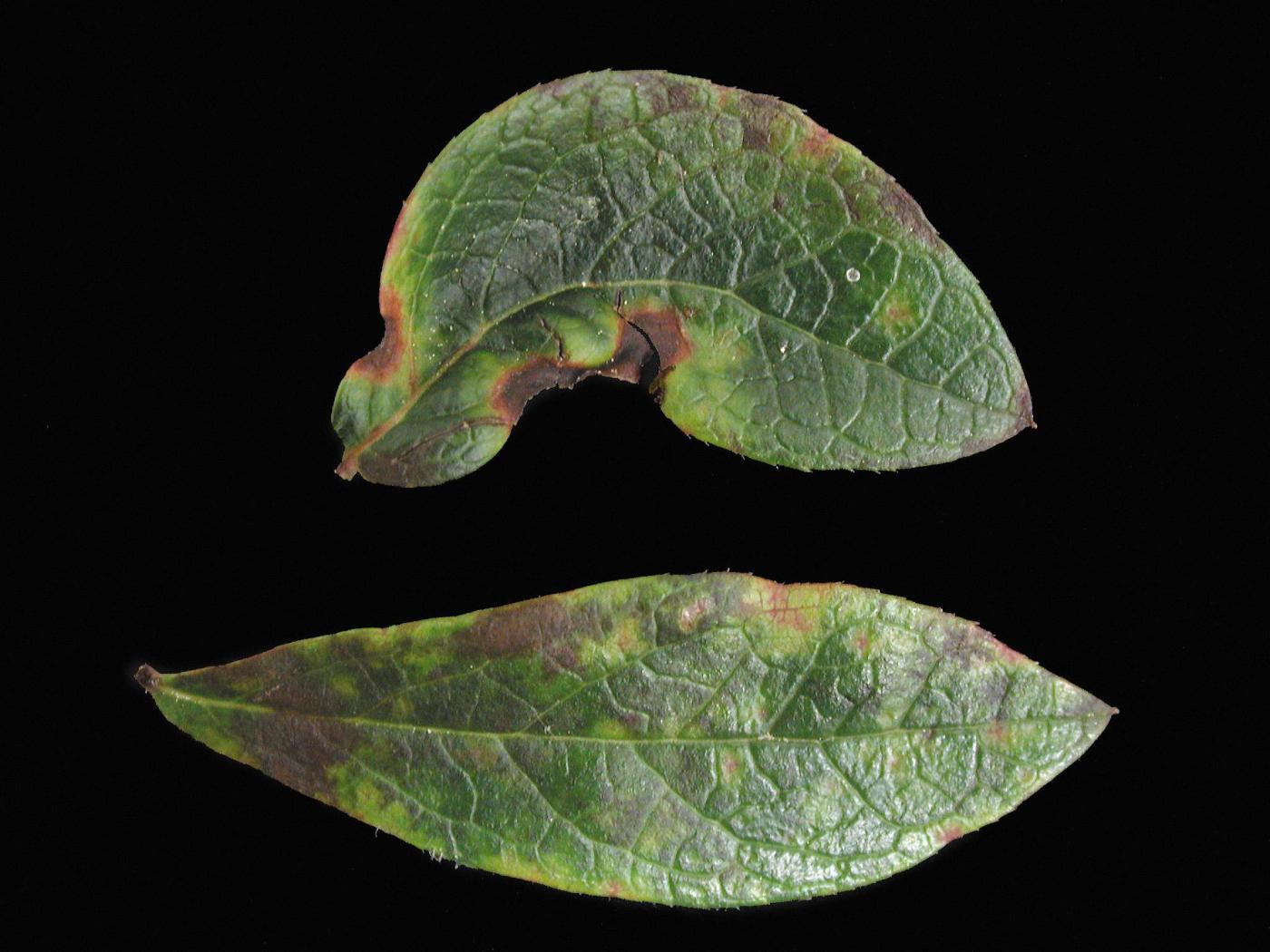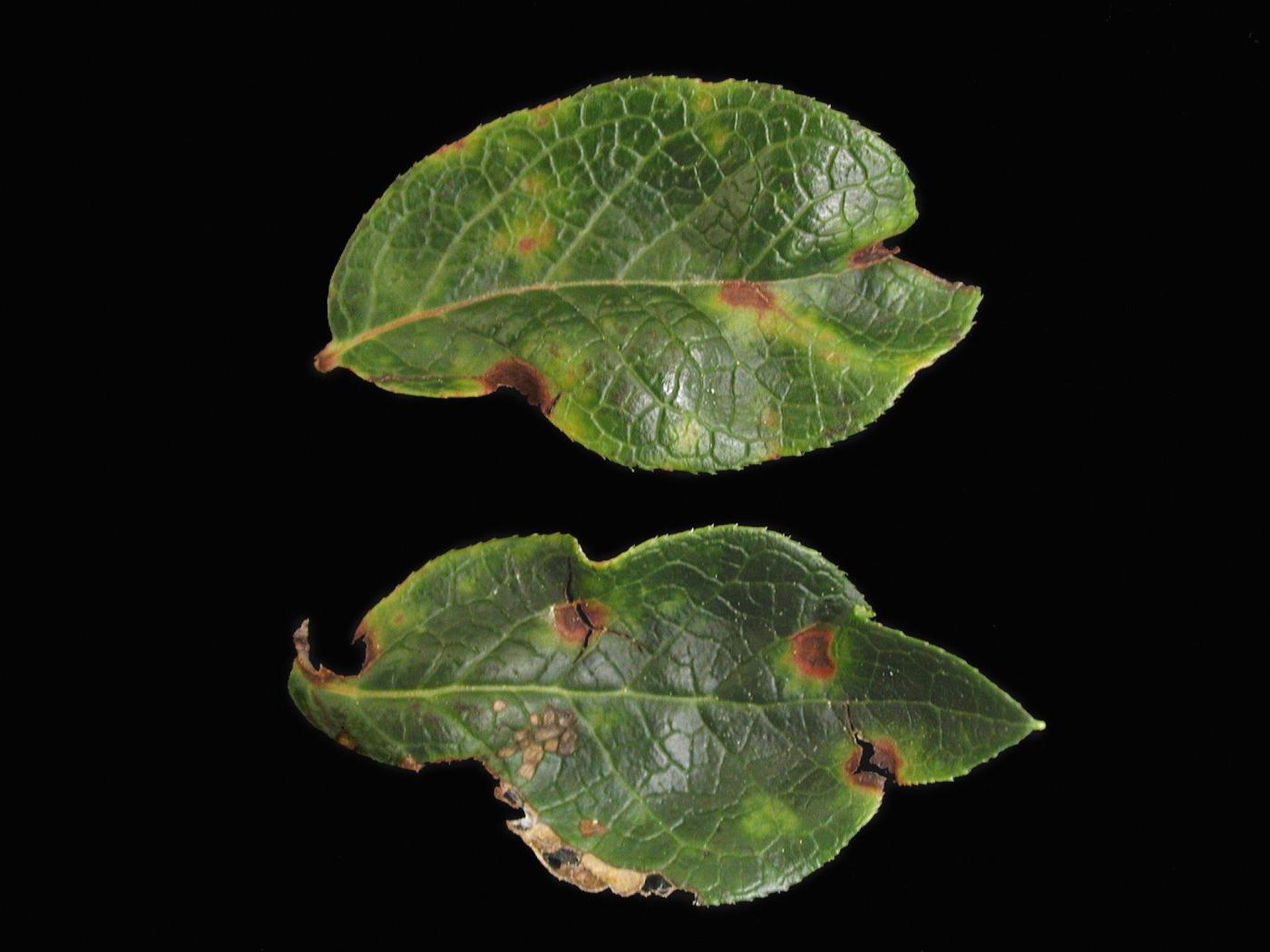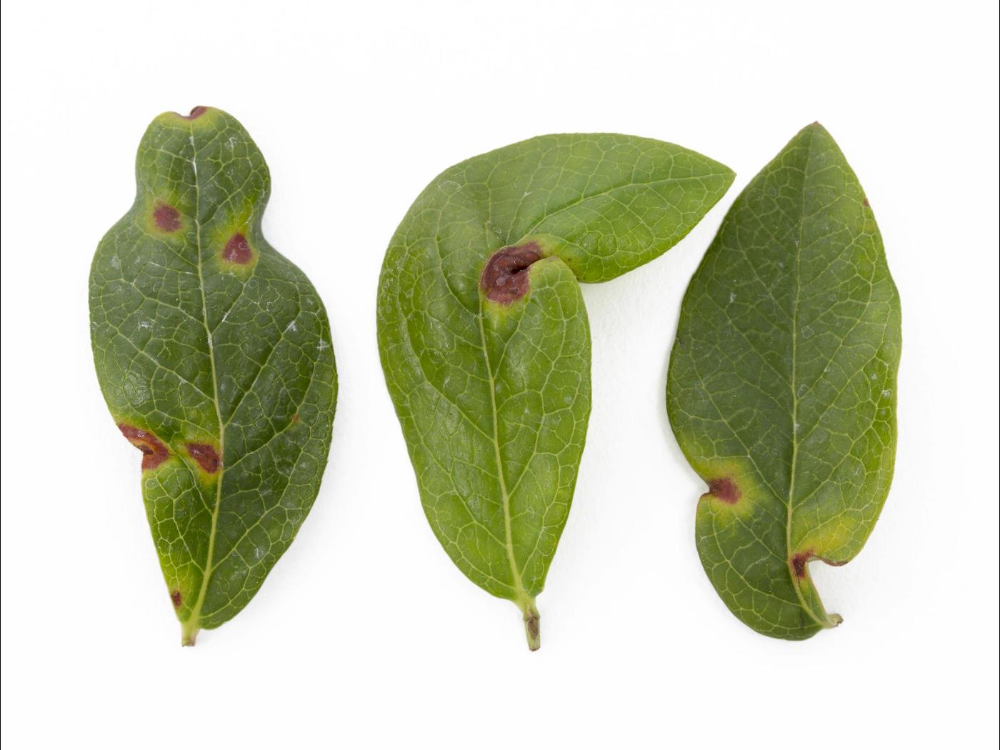 Feuille : sur les jeunes feuilles, présence de taches circulaires, rouges à brunes, souvent entourées d’un halo jaune à jaune verdâtre. Les taches mesurent entre 2 et 5 mm de diamètre. Les taches sèchent puis tombent. Les feuilles sont plus petites, plus épaisses et très rapprochées sur la tige de sorte qu’elles prennent l’apparence de rosettes. Déformation de la feuille conférant au limbe une forme sinueuse.