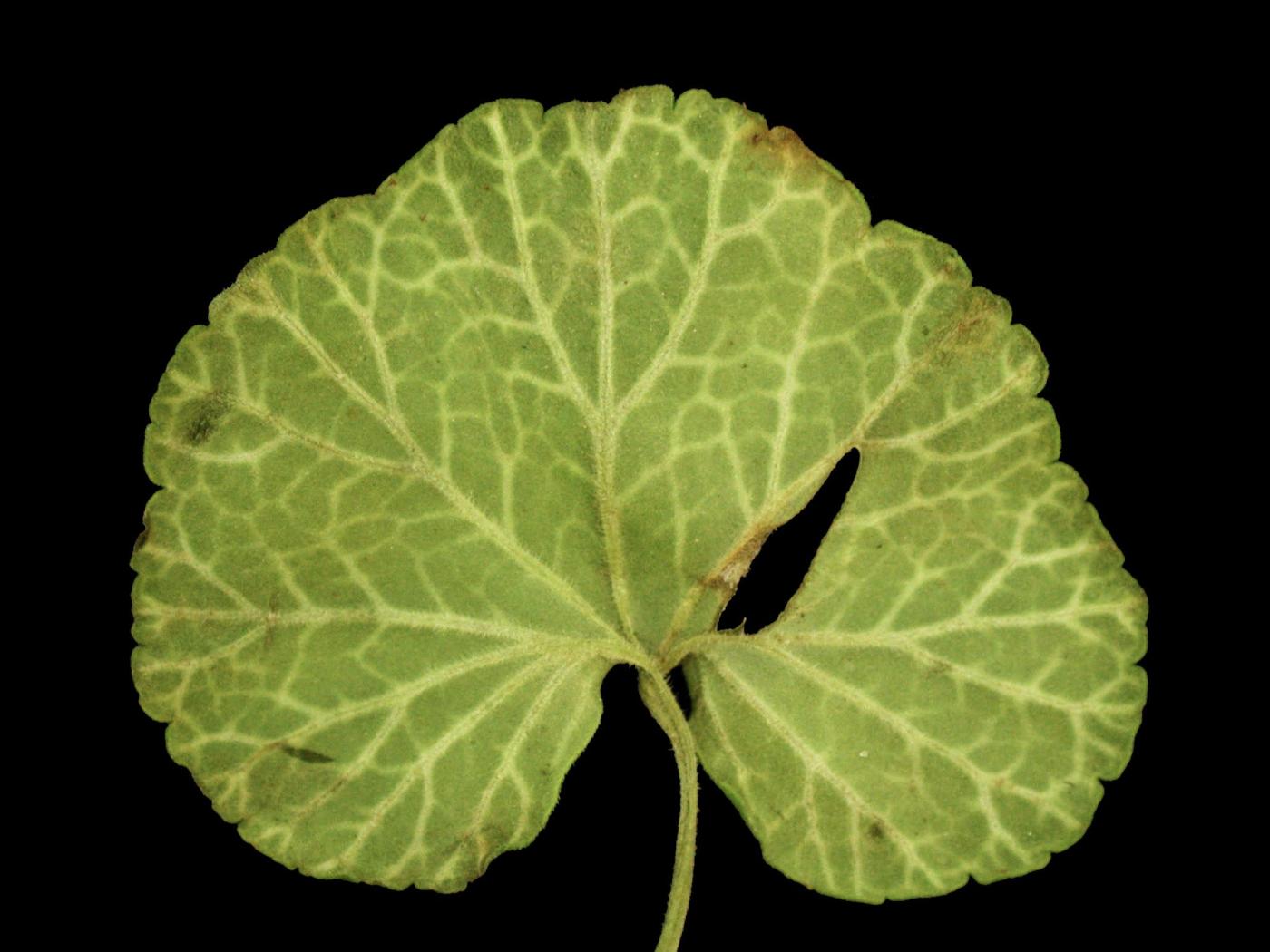 Description: La face inférieure d’une feuille de géranium montre un jaunissement important des nervures principales et secondaires. Le symptôme prend la forme d’un réseau de nervures claires. Tous les autres organes de la plante sont sans symptôme. Le Laboratoire de diagnostic de Guelph a détecté des particules virales dans les feuilles aux nervures jaunes. Il pourrait s'agir du virus de l’éclaircissement des nervures du pélargonium (PVCV).