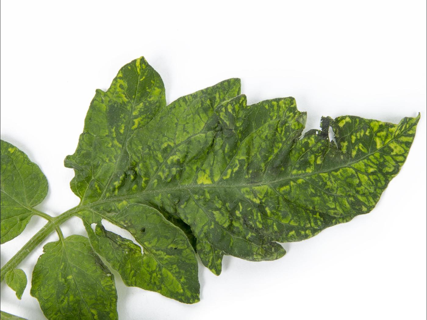 Légende: Anomalie de coloration sur une feuille de tomate causée par le virus du fruit brun rugueux de la tomate (Tomato brown rugose fruit virus, ToBRFV)