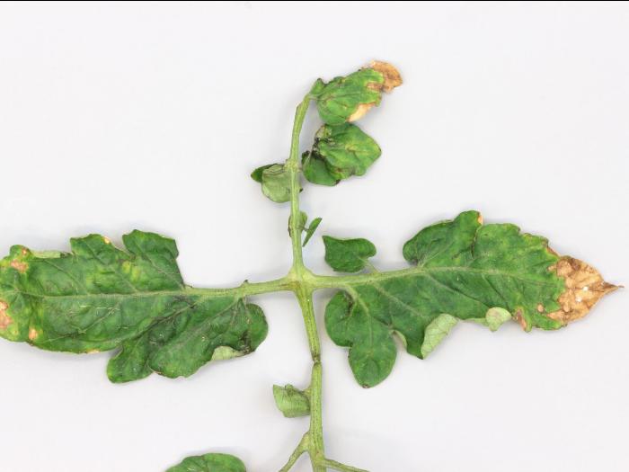 Description: Une foliole de tomate de serre (cv 'Trust') montre une mosaïque jaune et vert pâle débutant dans la partie basale de la foliole. Des brûlures discrètes sont visibles dans les zones avec des anomalies de coloration. Les tests de laboratoire ont révélé la présence du virus Y de la pomme de terre (PVY).
