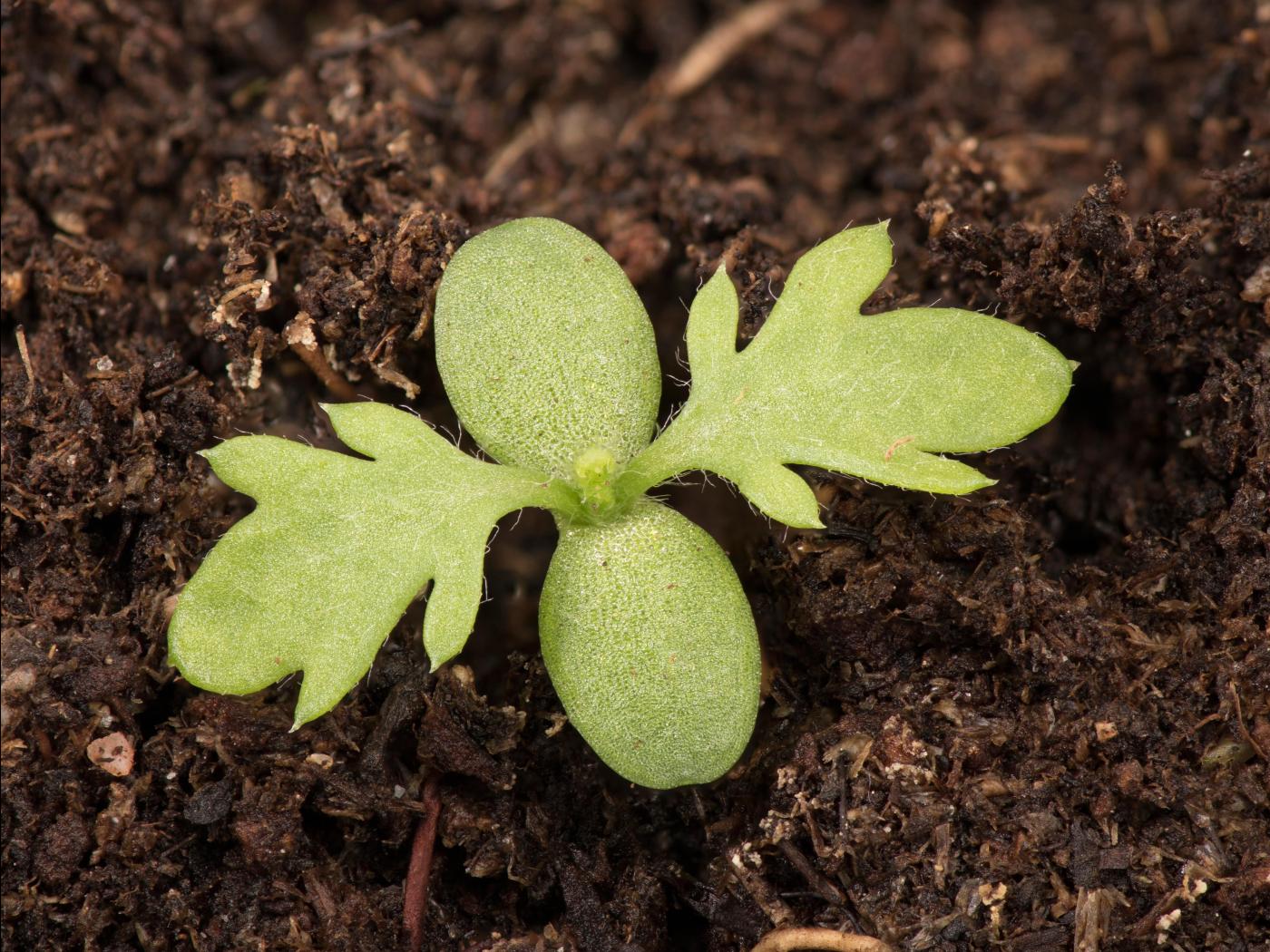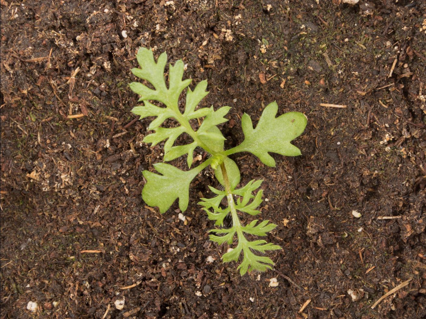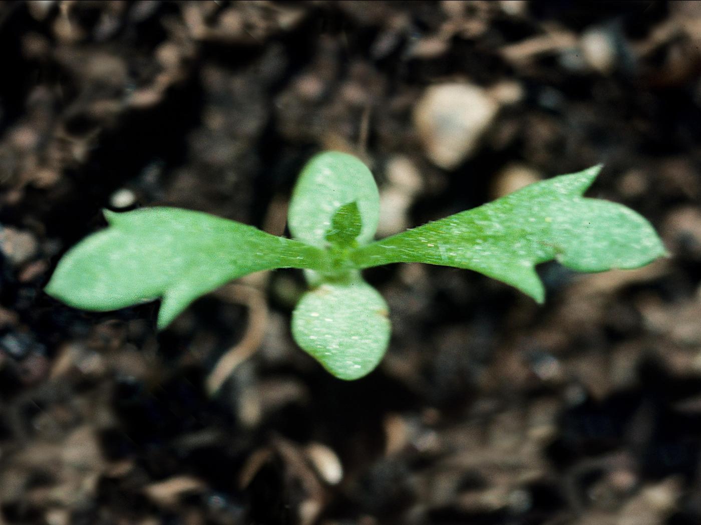 La plantule possède des feuilles alternes (exception : les deux premières sont opposées) disposées en rosette. Les cotylédons sont orbiculaires et mesurent de 2,5 à 3,5 mm de longueur et 2 mm de largeur. Les premières feuilles sont étroites et munies de 3 à 5 lobes ou dents nettement mucronés. La coloration des jeunes feuilles est vert foncé.