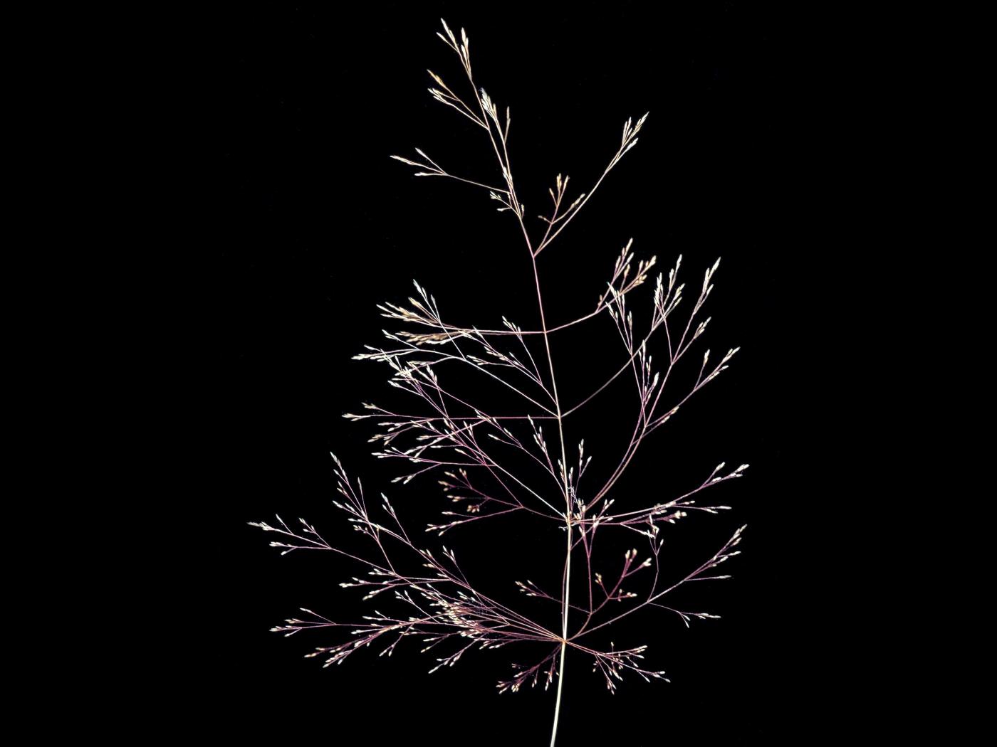 L’inflorescence est une panicule diffuse, de forme largement ovée qui mesure de 8 à 25 cm de longueur. Les branches de la panicule sont fines, scabres et mesurent de 4 à 12 cm de longueur. Les épillets se situent à l’extrémité des branches. Ils sont de forme lancéolée et mesurent moins de 3 mm de longueur. Ces derniers sont colorés de violet et de vert et sont composés d’un seul fleuron. Les glumes sont inégales, de forme lancéolée avec un apex acuminé et comprennent une nervure. Elles mesurent de 1,5 à 3 mm de longueur.