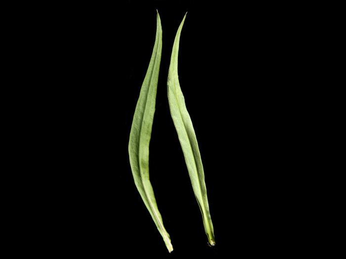 Les feuilles sont alternes, sessiles sur la tige et glabres. Le limbe est de forme linéaire à lancéolée ou elliptique avec un apex acuminé et une base légèrement embrassante. Il mesure de 5 à 15 cm de longueur et de 1 à 2 cm de largeur. La marge des feuilles est entière ou faiblement dentée et elle se prolonge sur la tige par une ligne de poils.