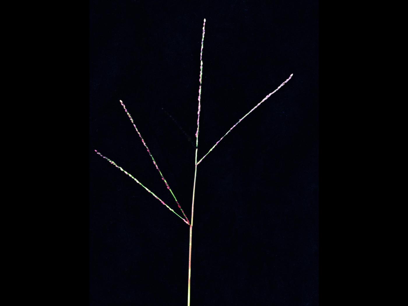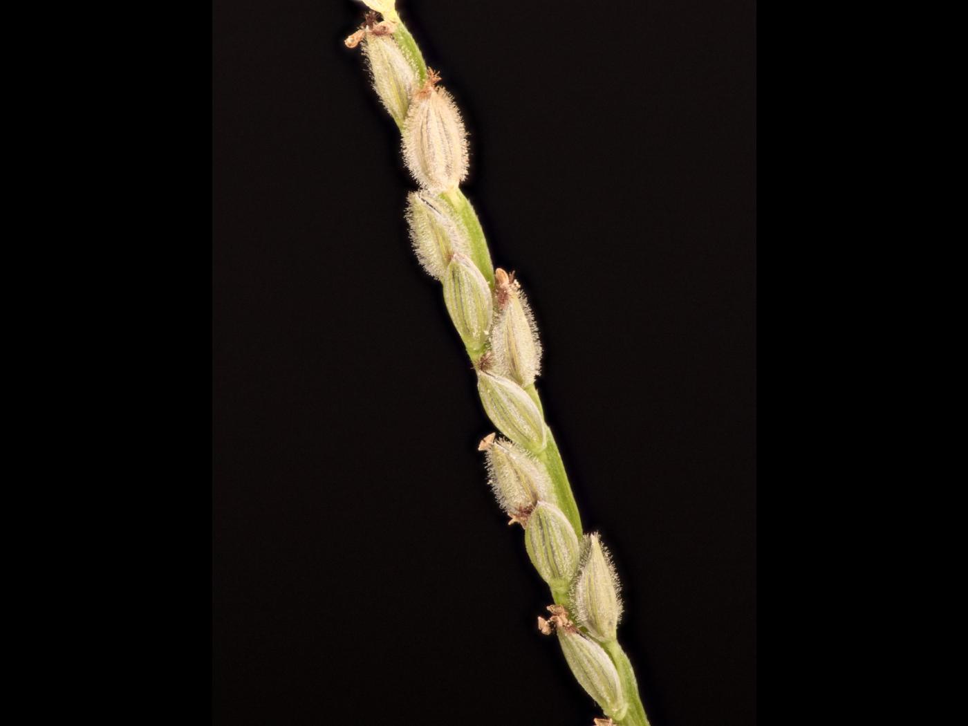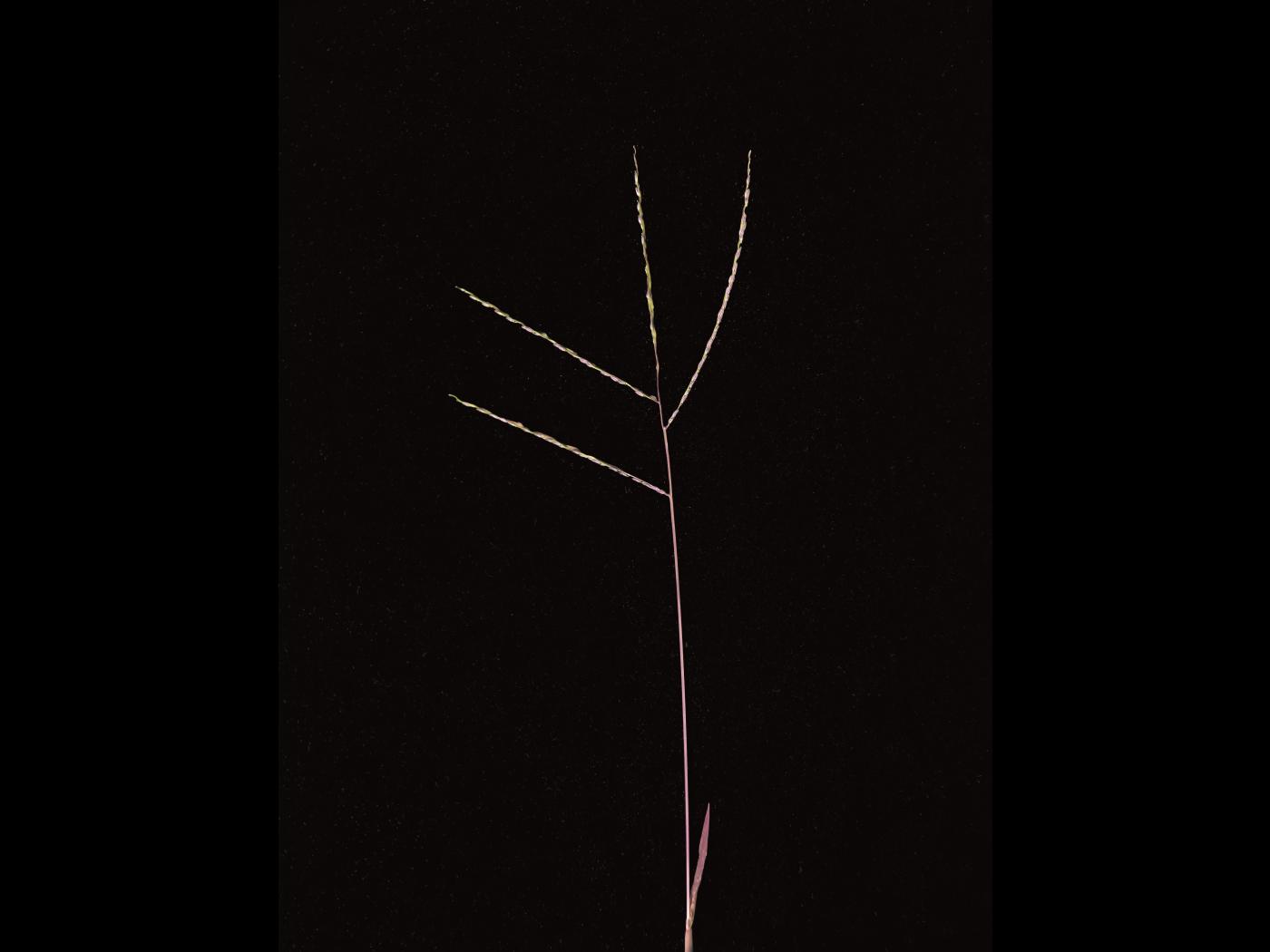 L’inflorescence est une panicule composée de 2 à 6 branches spiciformes et grêles qui mesurent de 6 à 15,5 cm de longueur. Les branches sont étalées comme les doigts d’une main (digitées) et attachées à un axe central. Chaque branche est composée de 2 rangées d’épillets attachées le long du rachis, qui est vert, ailé et glabre. Les épillets sont de forme elliptique à lancéolée et mesurent de 1,7 à 2,3 mm de longueur. Ils sont vert foncé à vert-mauve et sont composés de 2 fleurons, un fertile et un stérile. La glume inférieure est absente ou réduite et membraneuse. La glume supérieure est elliptique, pubescente, à 5 nervures et mesure de 1,3 à 2,3 mm de longueur.