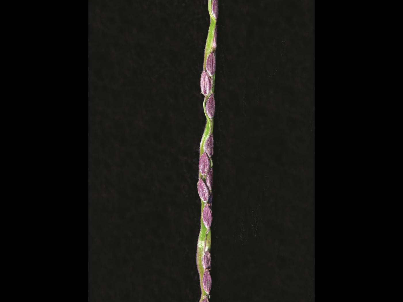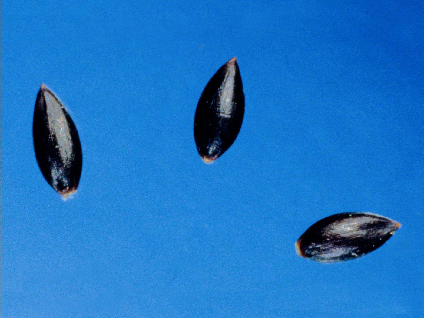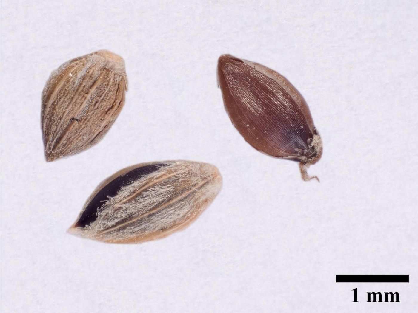 Le fruit est un caryopse enveloppé par les pièces florales coriaces. Il est de forme elliptique, de couleur brun foncé à presque noir et mesure 2 mm de longueur.