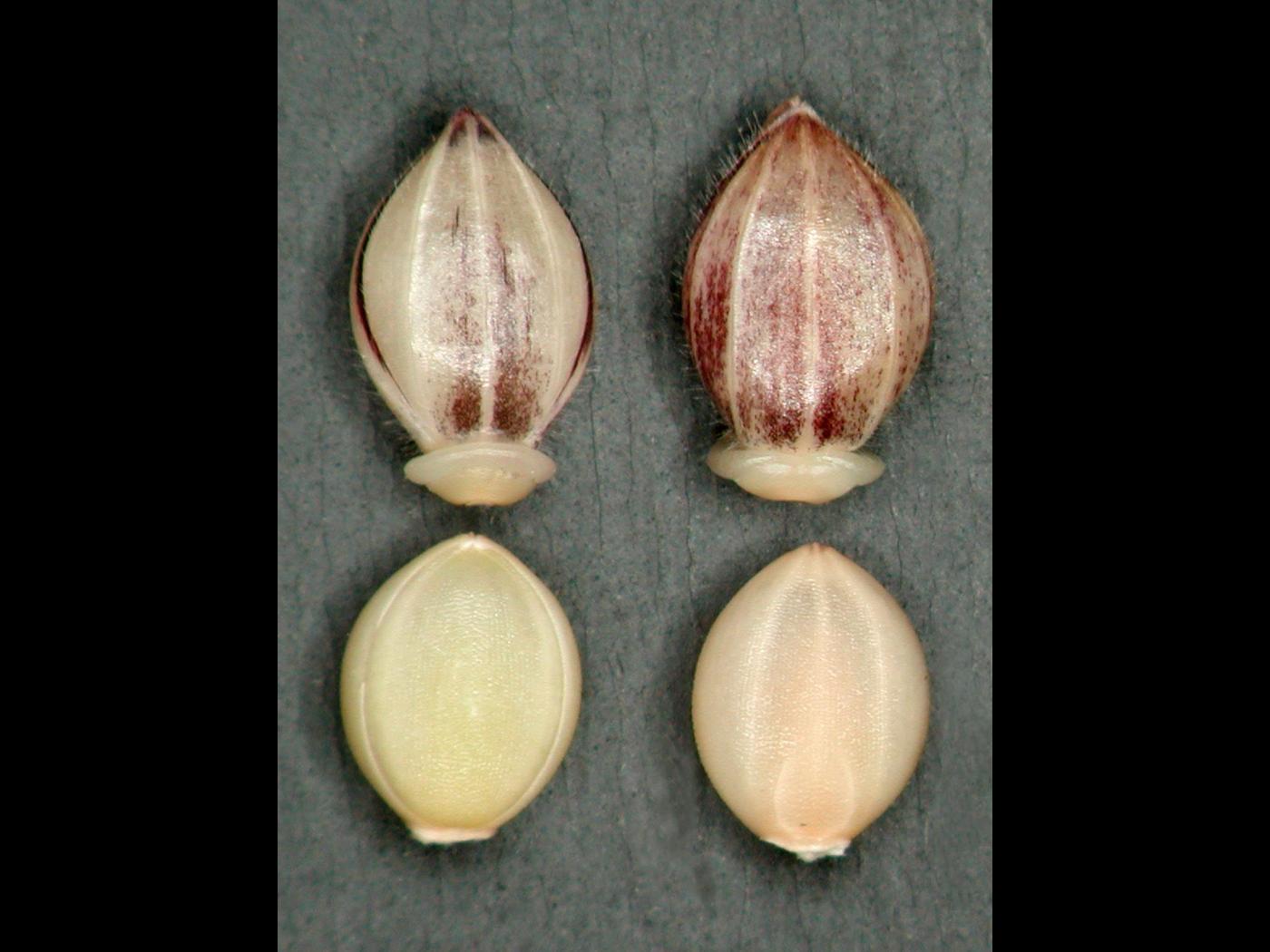 Le fruit est un caryopse volumineux enveloppé par les pièces florales coriaces, mesurant de 2,8 à 4,0 mm de longueur et de 1,8 à 2,7 mm de diamètre. Il est de forme ovale presque sphérique et légèrement aplati sur un côté. Il est de couleur vert clair ou brun avec des taches rouge-pourpre à maturité.