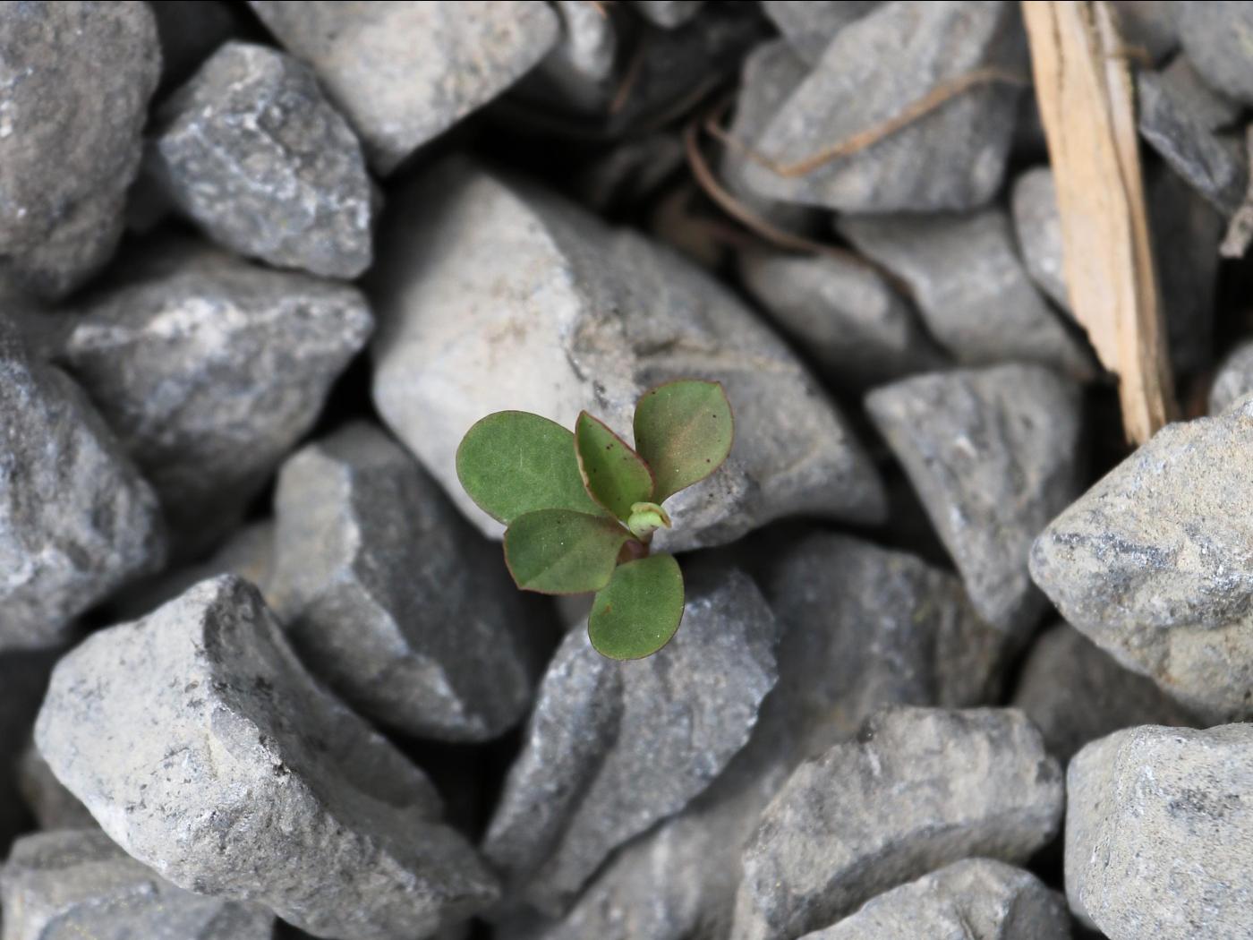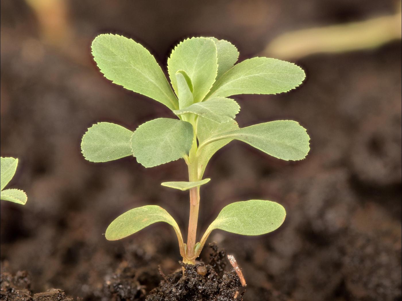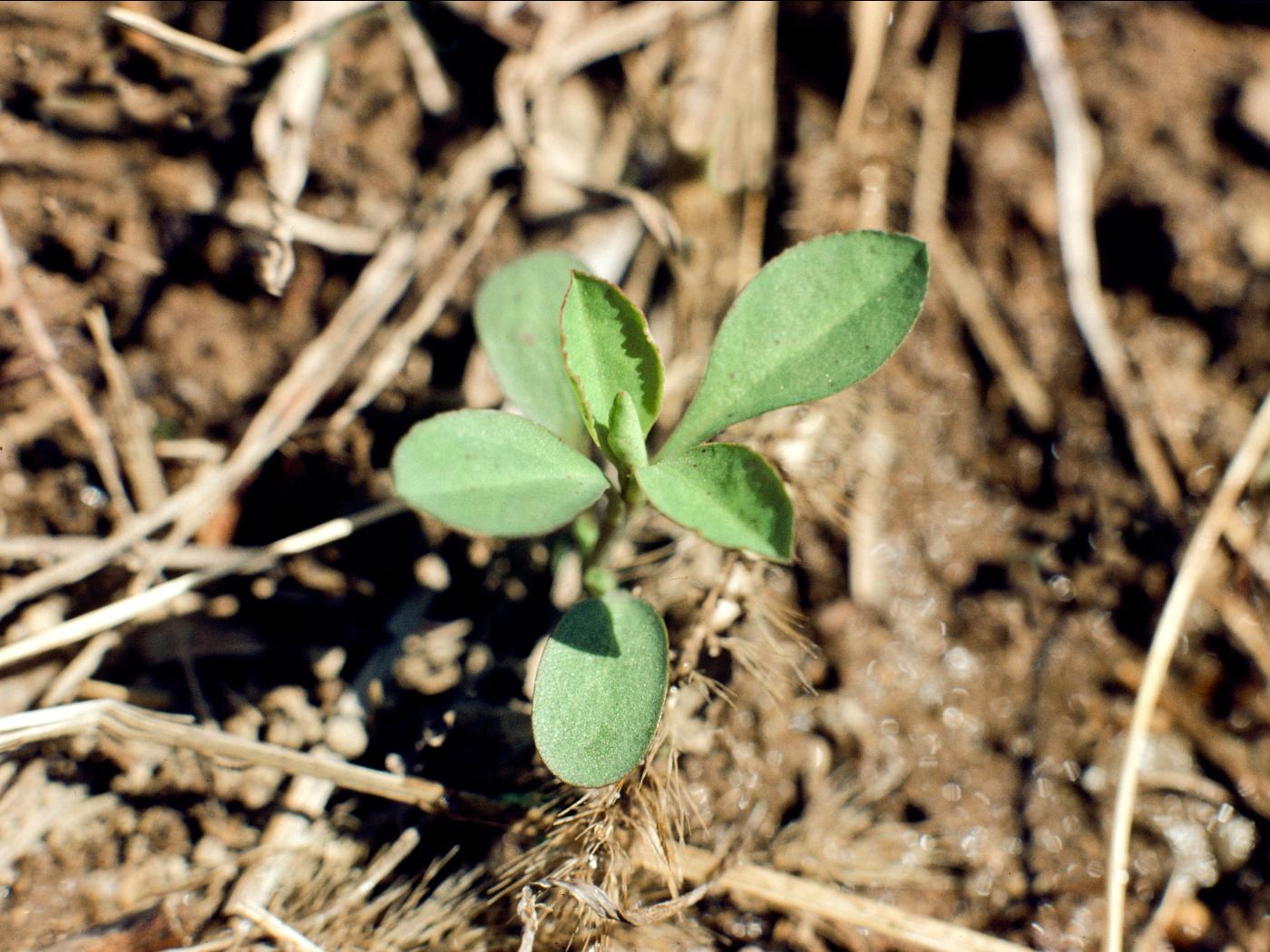 La plantule a une tige rougeâtre qui mesure de 1 à 2 cm. Les cotylédons sont oblongs, persistants et possèdent un pétiole distinct. Ils mesurent de 8 à 15 mm de long, de 4 à 6 mm de large et sont rougeâtres à la face inférieure. Le sommet des cotylédons est d’abord tronqué pour devenir arrondi ultérieurement. Les deux premières feuilles sont opposées puis les suivantes sont alternes. Elles sont vert bleuté avec une légère pilosité et elles sont finement dentées.