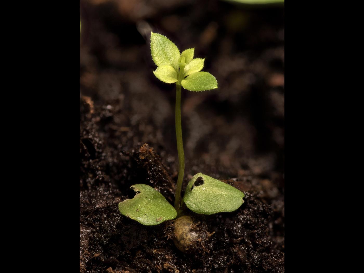 La plantule est totalement glabre. Elle est munie de cotylédons de forme oblongue dont la longueur varie entre 8 et 11 mm et la largeur entre 3,5 et 4,5 mm. Les premières feuilles mesurent entre 6 et 7 mm de long, 3 et 4 mm de large et sont disposées en verticille de 4. L’apex des feuilles devient plus pointu et rigide à partir du deuxième verticille de feuilles.