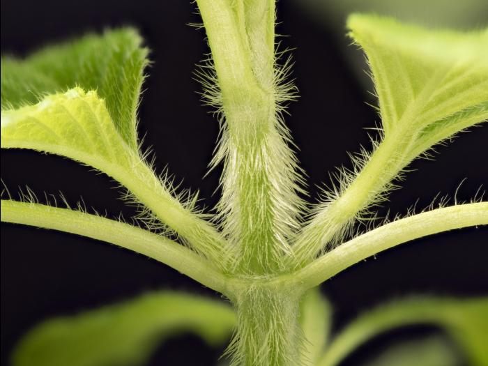 La plantule est de couleur vert clair et les feuilles sont opposées. Les cotylédons sont de forme orbiculaire et se terminent, de chaque côté du pétiole, par une dent étroite visible à l’œil nu. Leur pétiole est poilu et aussi long que le limbe. Les premières feuilles sont lancéolées, faiblement dentées et pétiolées.
