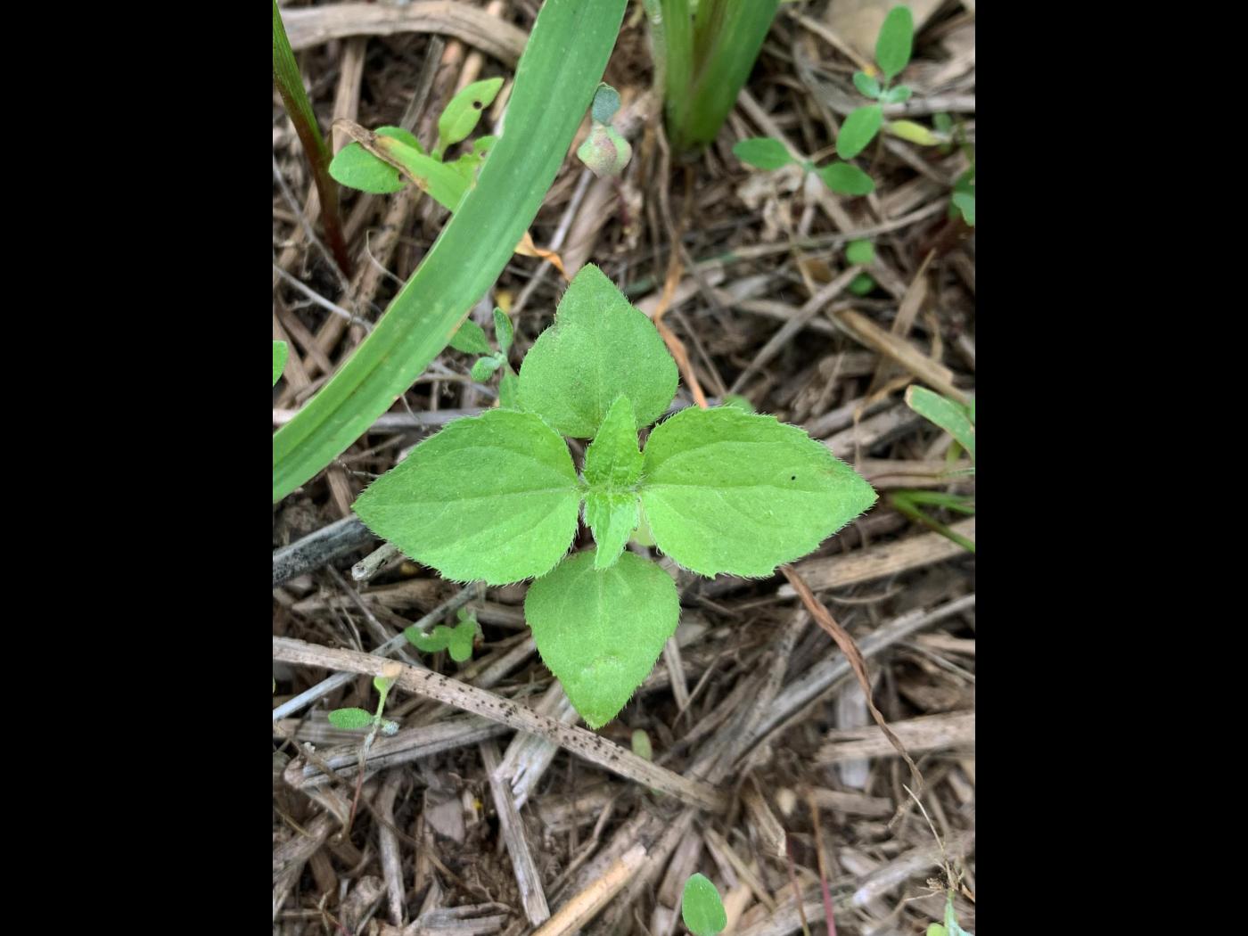 La plantule possède des feuilles opposées d’une teinte vert jaunâtre. Les cotylédons orbiculaires sont légèrement échancrés au sommet et présentent une petite pointe. Ils mesurent de 4 à 8 mm de long et sont munis d’un pétiole mesurant de 7 à 9 mm de long. Les deux premières feuilles sont triangulaires à sommet mucroné. Elles sont peu dentées et garnies de poils blancs.