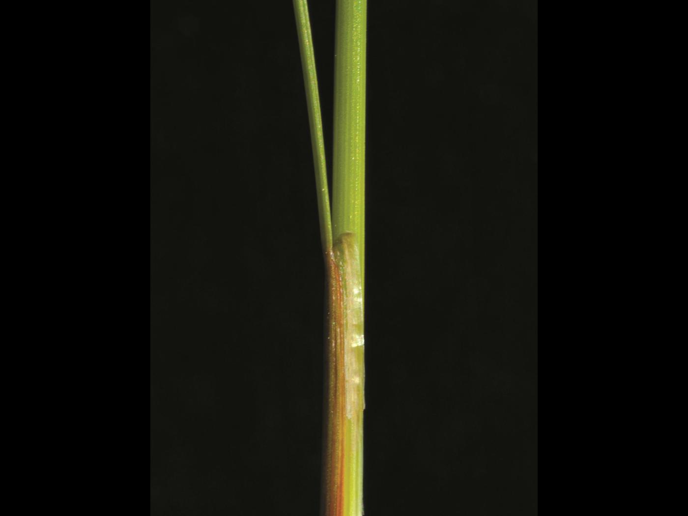 Les feuilles ressemblent à celles des graminées. Le limbe est plat, linéaire et à marge entière. Il mesure de 3 à 12 cm de longueur et de 0,5 à 1 mm de largeur. La gaine est terminée par des auricules : un appendice membraneux, blanchâtre et de forme arrondie qui mesure jusqu’à 5 mm de longueur. Il n’y a pas de ligule à la jonction du limbe et de la gaine. Les feuilles se situent toutes à la base du plant.