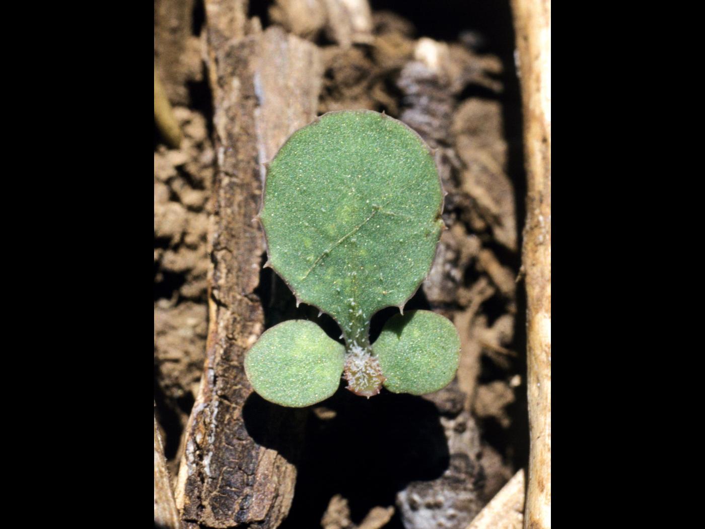 La plantule est constituée de feuilles alternes qui forment une rosette. Les cotylédons sont de forme orbiculaire à oblongue, ont un sommet arrondi à tronqué et possèdent un pétiole court. Le limbe mesure de 3 à 6 mm de longueur et la face inférieure est souvent teintée de rouge violet. Les premières feuilles sont de forme arrondie ovale à allongée avec une marge sinuée dentée.