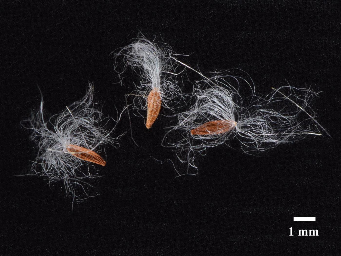 Les fruits sont des cypsèles de couleur brun paille à brun rougeâtre. Elles sont minces, aplaties et modérément ailées sur la marge. Elles sont de forme ellipsoïde et mesurent 2,5 mm de longueur. Elles ont de 3 à 5 nervures longitudinales sur chaque face. Elles possèdent une aigrette constituée de longues soies blanches non ramifiées mesurant de 6 à 9 mm de longueur. Les soies au centre sont rigides et celles en périphérie sont flexibles et munies d’un apex en crochet.