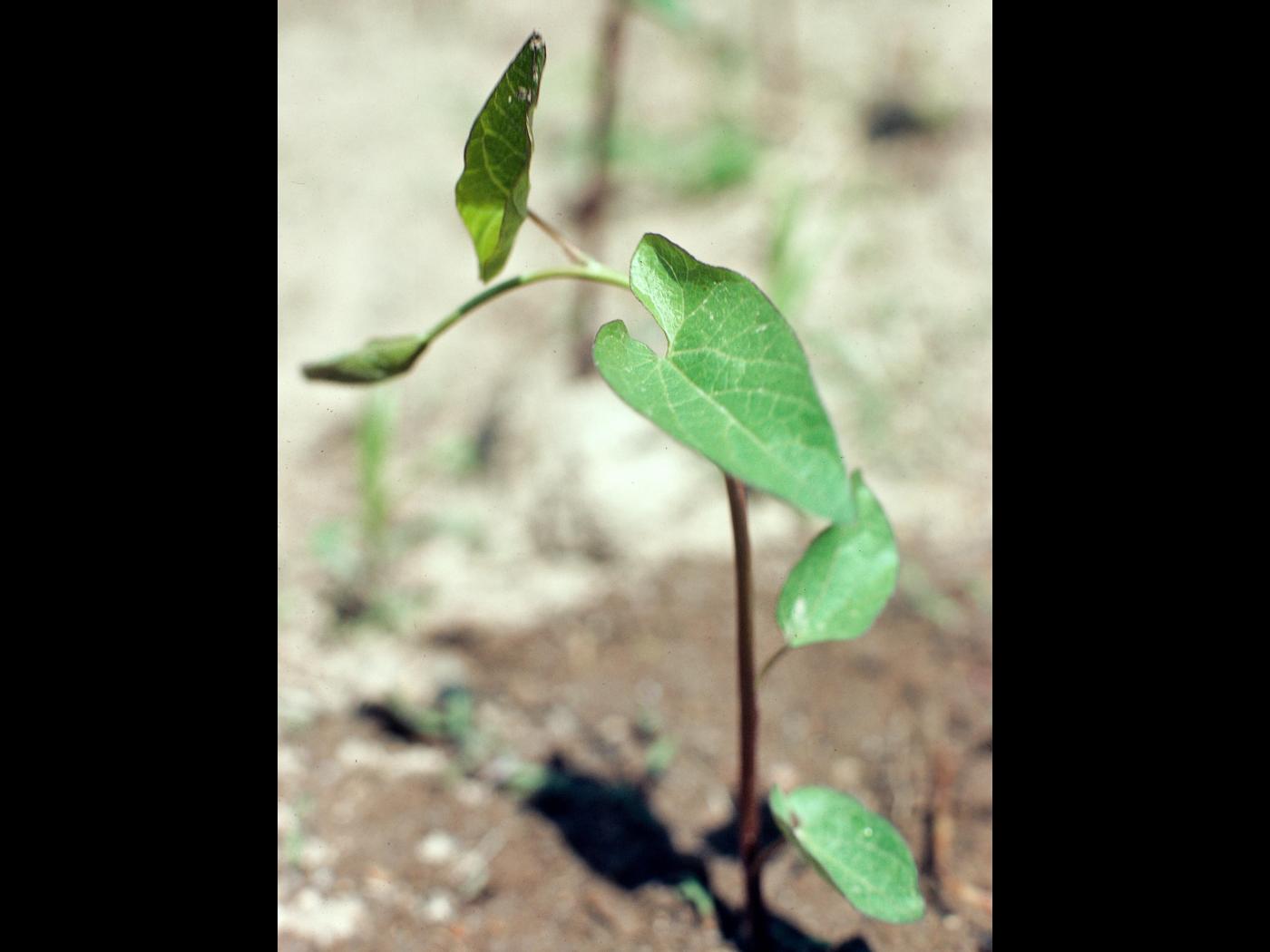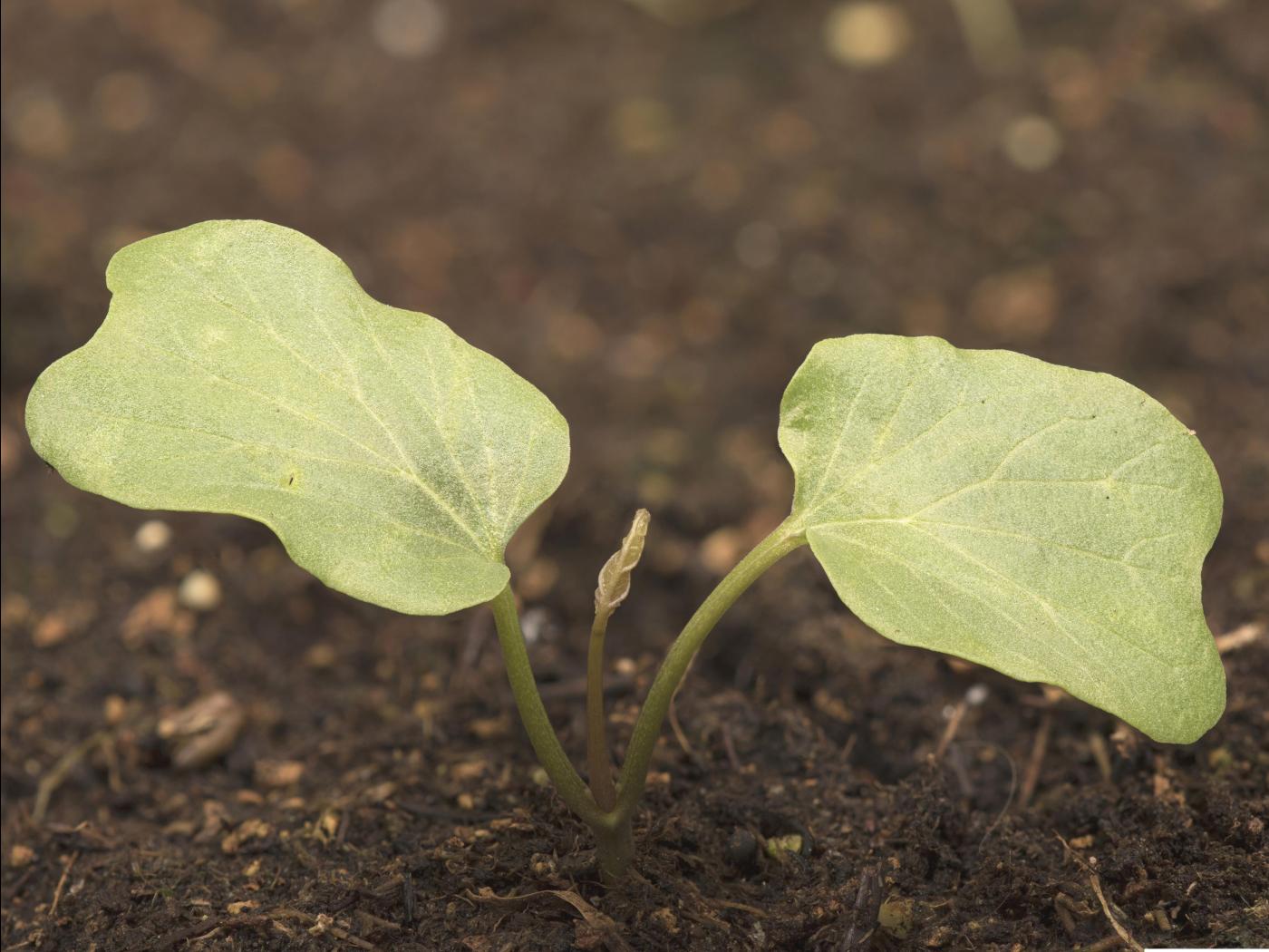 La plantule se compose de feuilles alternes sur une tige qui est souvent colorée de brun rougeâtre. Les cotylédons mesurent de 1 à 3 cm de longueur et de 1,5 à 2 cm de largeur. Ils sont de forme carrée, à sommet échancré et à base légèrement cordiforme. Des nervures blanchâtres sont présentes sur le limbe. Les cotylédons sont portés par un pétiole qui mesure de 2 à 3 cm de longueur. Les premières feuilles sont semblables aux feuilles matures.