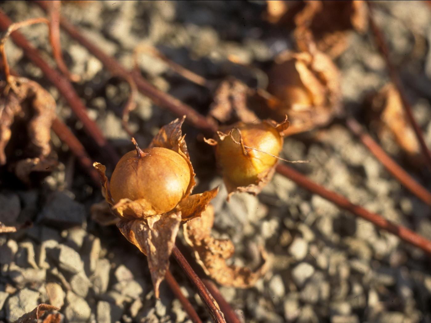 Les fruits sont des capsules arrondies à ovales qui mesurent 8 mm de diamètre. Les capsules contiennent de 2 à 4 graines qui mesurent de 4 à 5 mm de longueur. Ces dernières sont colorées de gris terne, de brun ou de noir. Elles ont un côté arrondi et deux côtés aplatis.