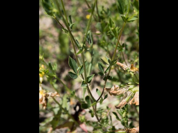Le lotier corniculé est une espèce vivace, originaire d’Eurasie. La tige a un port prostré à décombant et mesure jusqu’à 60 cm de longueur. Elle est mince, arrondie vers la base et anguleuse vers le sommet. Elle est glabre ou un peu pubescente. Le système racinaire est composé d’une racine pivotante, souvent divisée et descendant profondément dans le sol (jusqu’à 1 m).