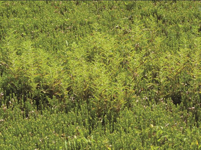 Légende: Plants, stade floraison, dans un champ de canneberges