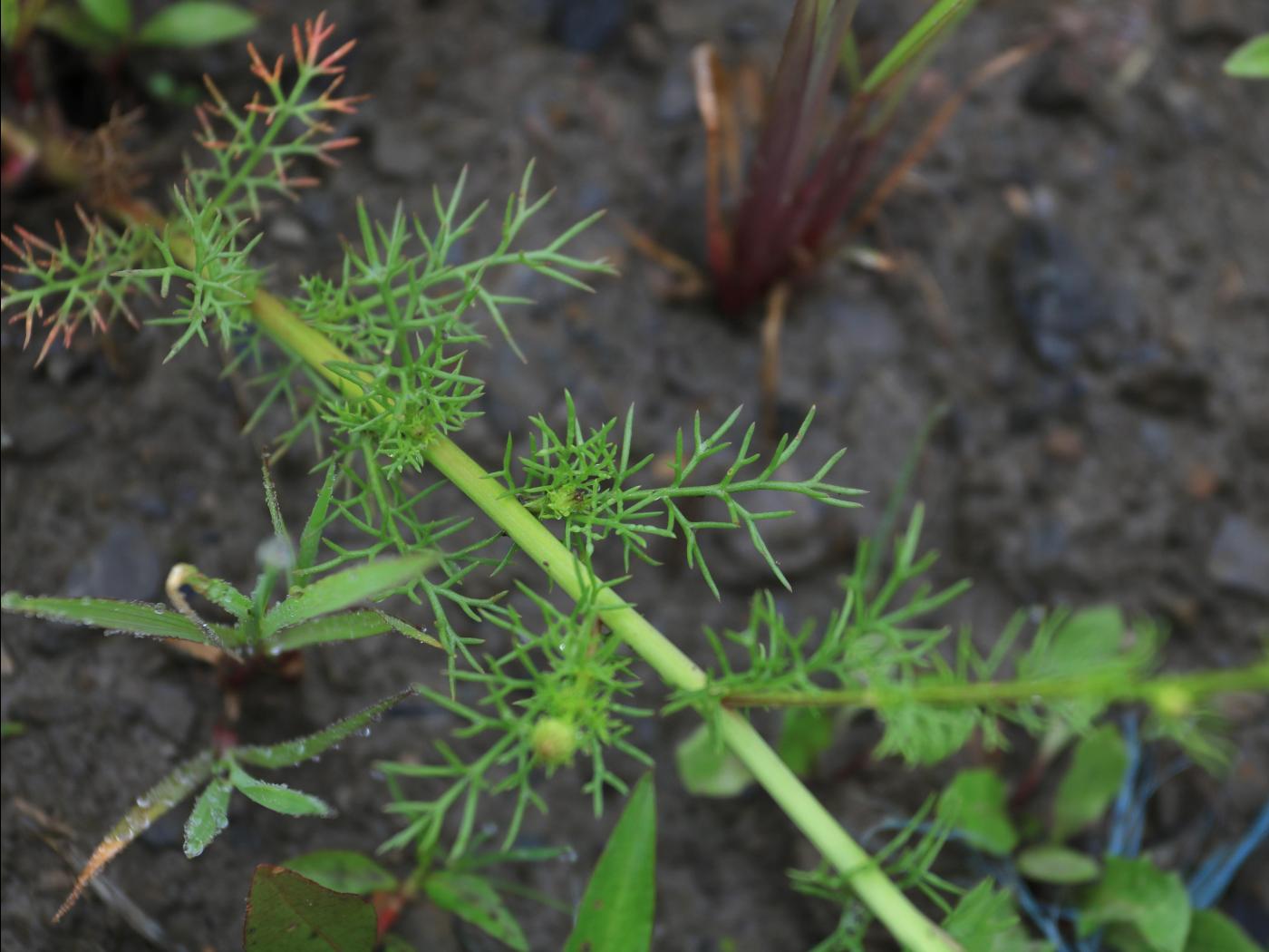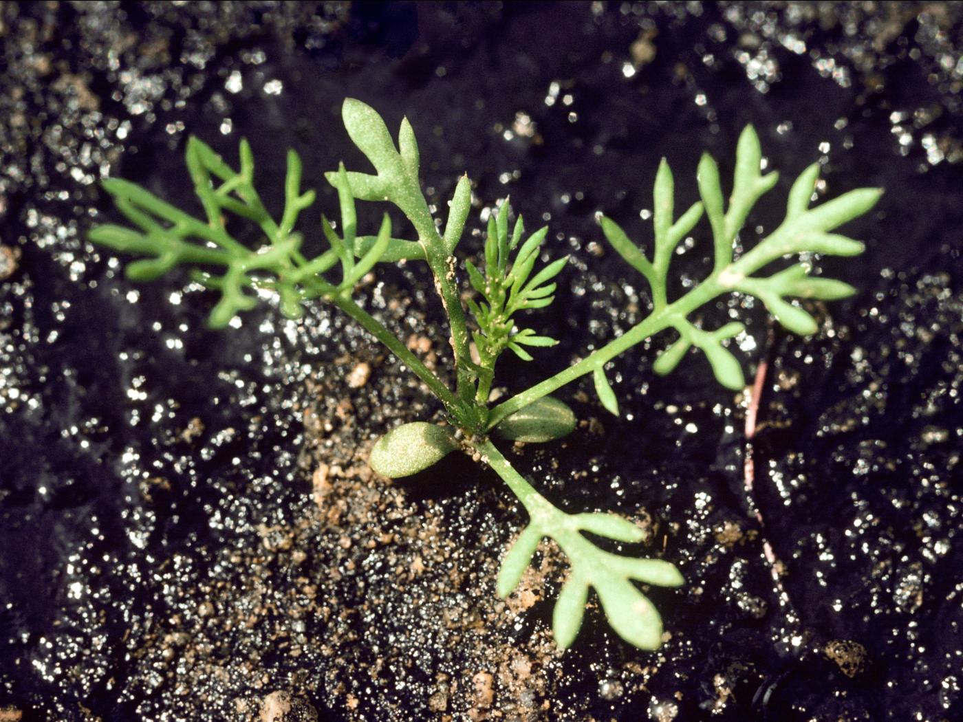 La plantule est à rosette, les 2 premières feuilles sont opposées et les suivantes sont alternes. Les cotylédons sont de forme orbiculaire à oblongue et mesurent de 3 à 3,5 mm de longueur. Ils sont verts, glabres et ne sont pas pétiolés. Les premières feuilles sont profondément découpées en 4 à 5 segments. Les suivantes sont semblables aux feuilles matures.