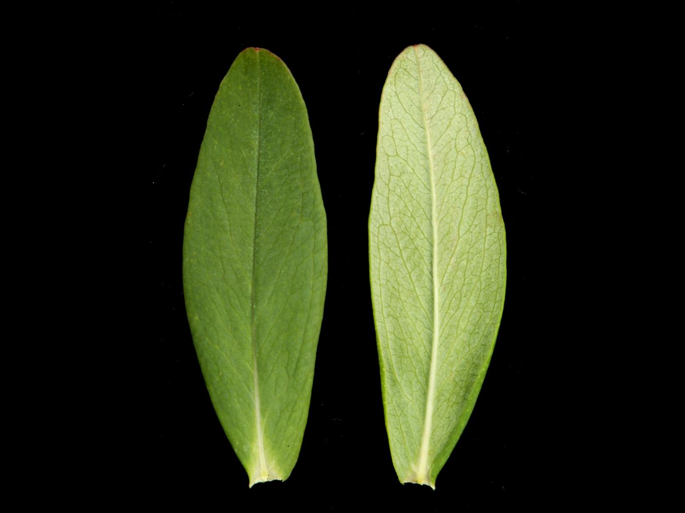 Les feuilles sont sessiles et opposées sur la tige. Le limbe est de forme elliptique ou oblongue lancéolée avec un sommet arrondi. Il mesure de 1,1 à 3,5 cm de longueur et de 0,3 à 1,3 cm de largeur. La base est cordée et elle entoure partiellement la tige.