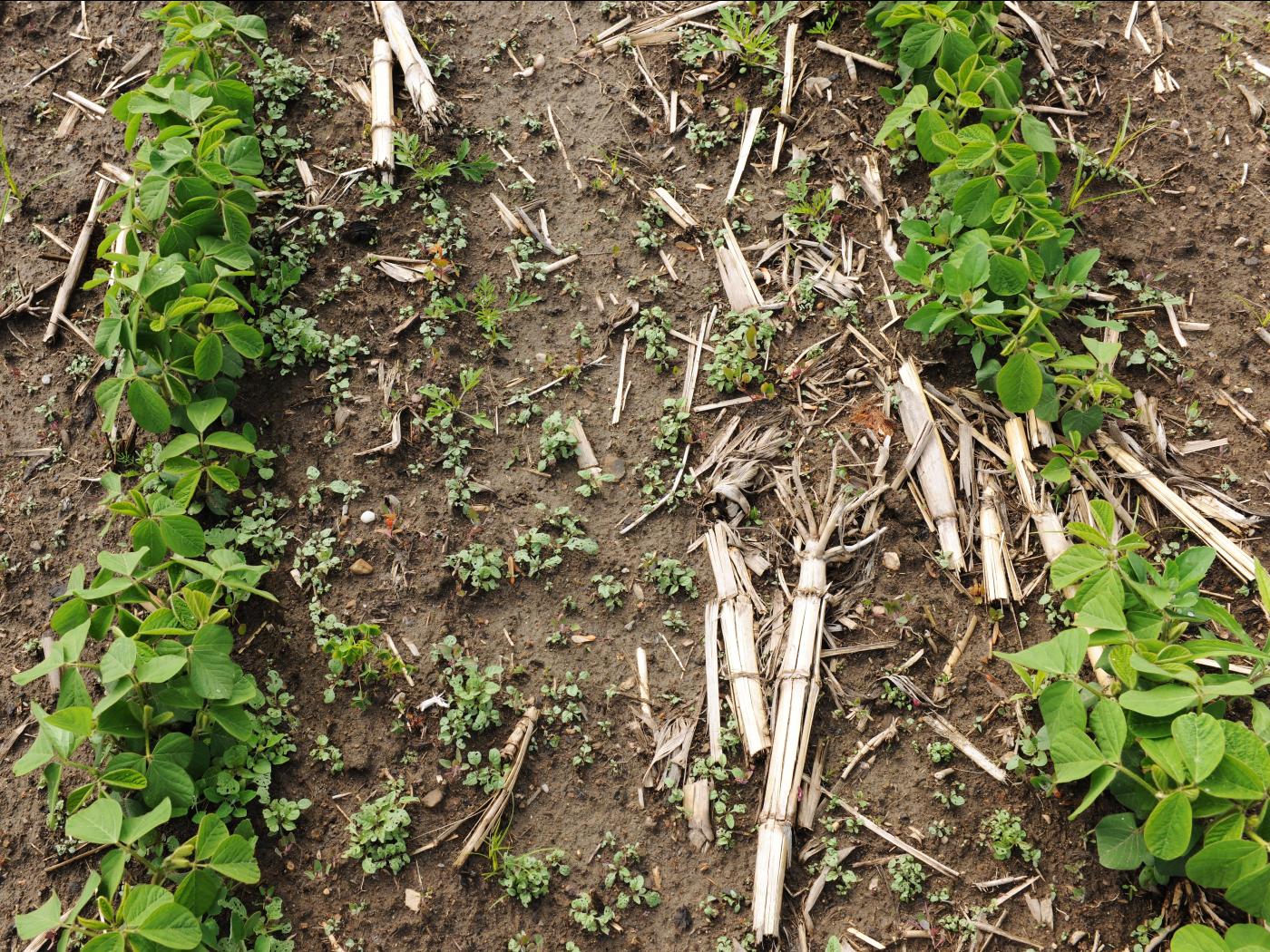 Légende: Plantules à différents stades, entre les rangs de soya en semis direct