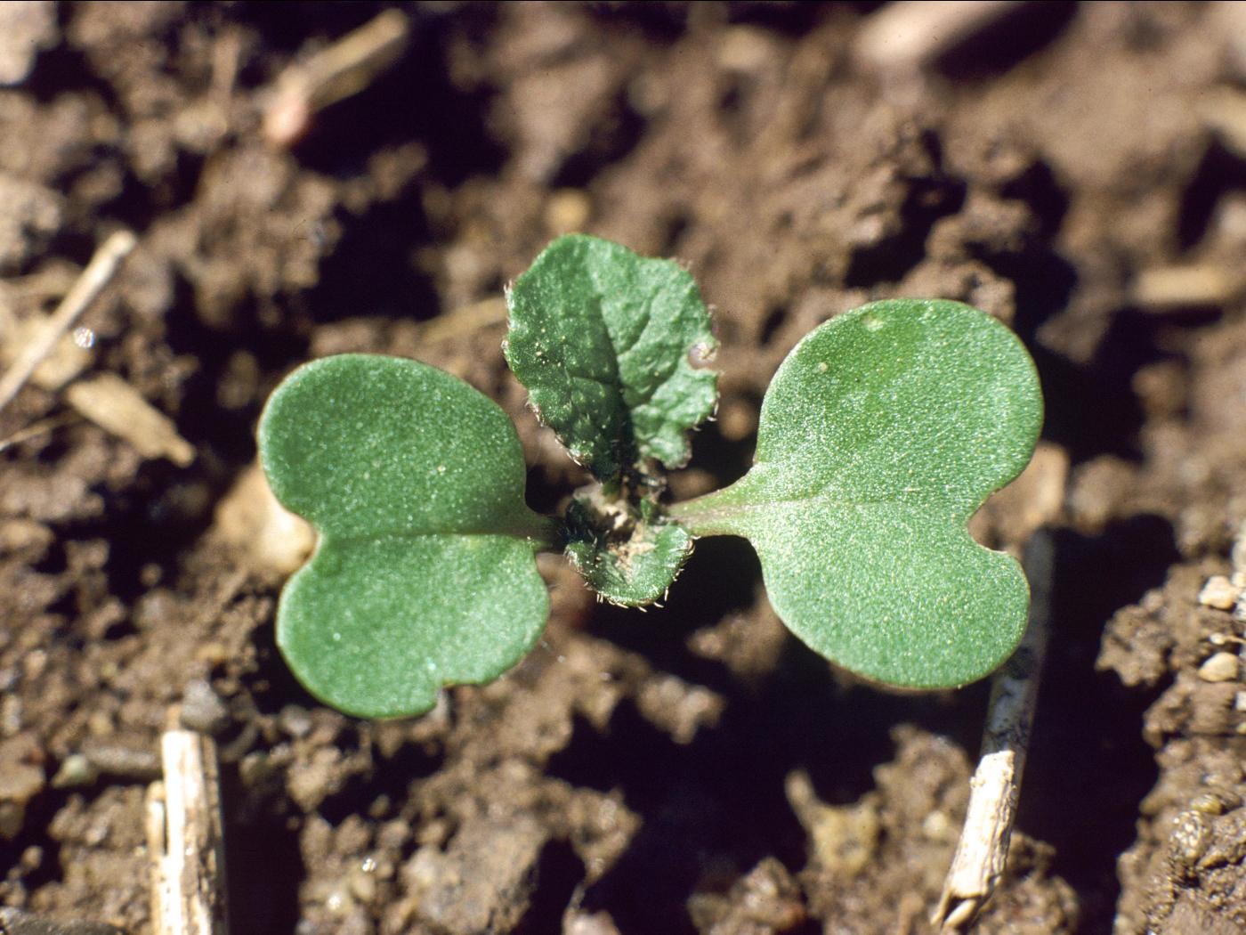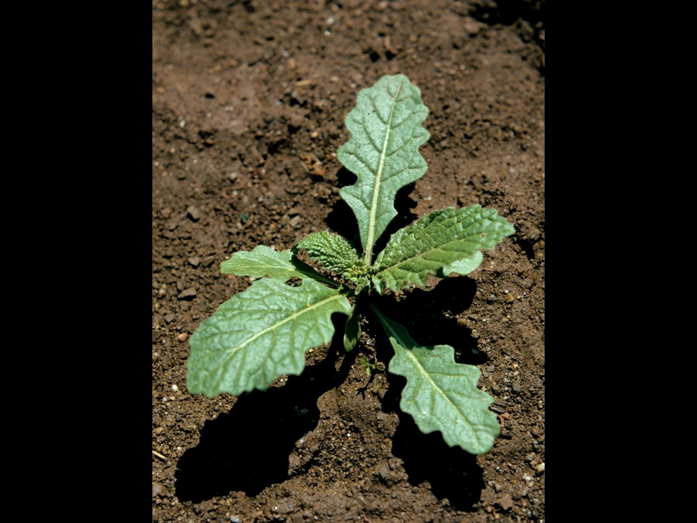 La plantule est composée de feuilles alternes disposées en rosette ou sur une courte tige. Les cotylédons mesurent de 14 à 20 mm de long et de 7 à 11 mm de large. Ils sont cordiformes et n’ont qu’une seule nervure médiane bien visible. Les premières et deuxièmes feuilles sont sinuées-dentées et arrondies, puis les deux suivantes sont sinuées-dentées à lobées et allongées. La cinquième a l’allure des feuilles matures, soit des segments dentés avec le segment terminal plus grand que les latéraux. Les feuilles possèdent des poils hérissés, mais presque lisses au toucher.