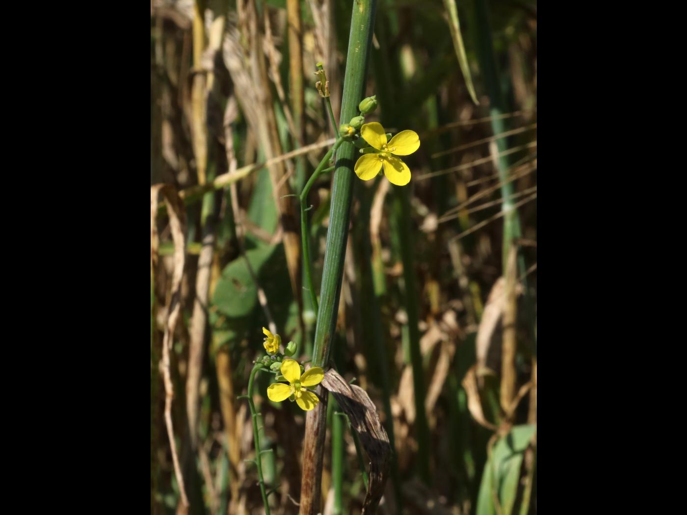 L’inflorescence se caractérise par un racème qui contient de nombreuses fleurs. Les fleurs ouvertes dans l’inflorescence se situent au-dessus ou au même niveau que les bourgeons floraux. Les fleurs sont en forme de croix, mesurent 1 cm de diamètre et sont composées de 4 sépales et de 4 pétales. Les sépales mesurent de 4 à 6,5 mm de longueur et de 1,5 à 2 mm de largeur. Les pétales sont jaune brillant, de forme obovée et mesurent de 6 à 11 mm de longueur et de 3 à 6 mm de largeur.
