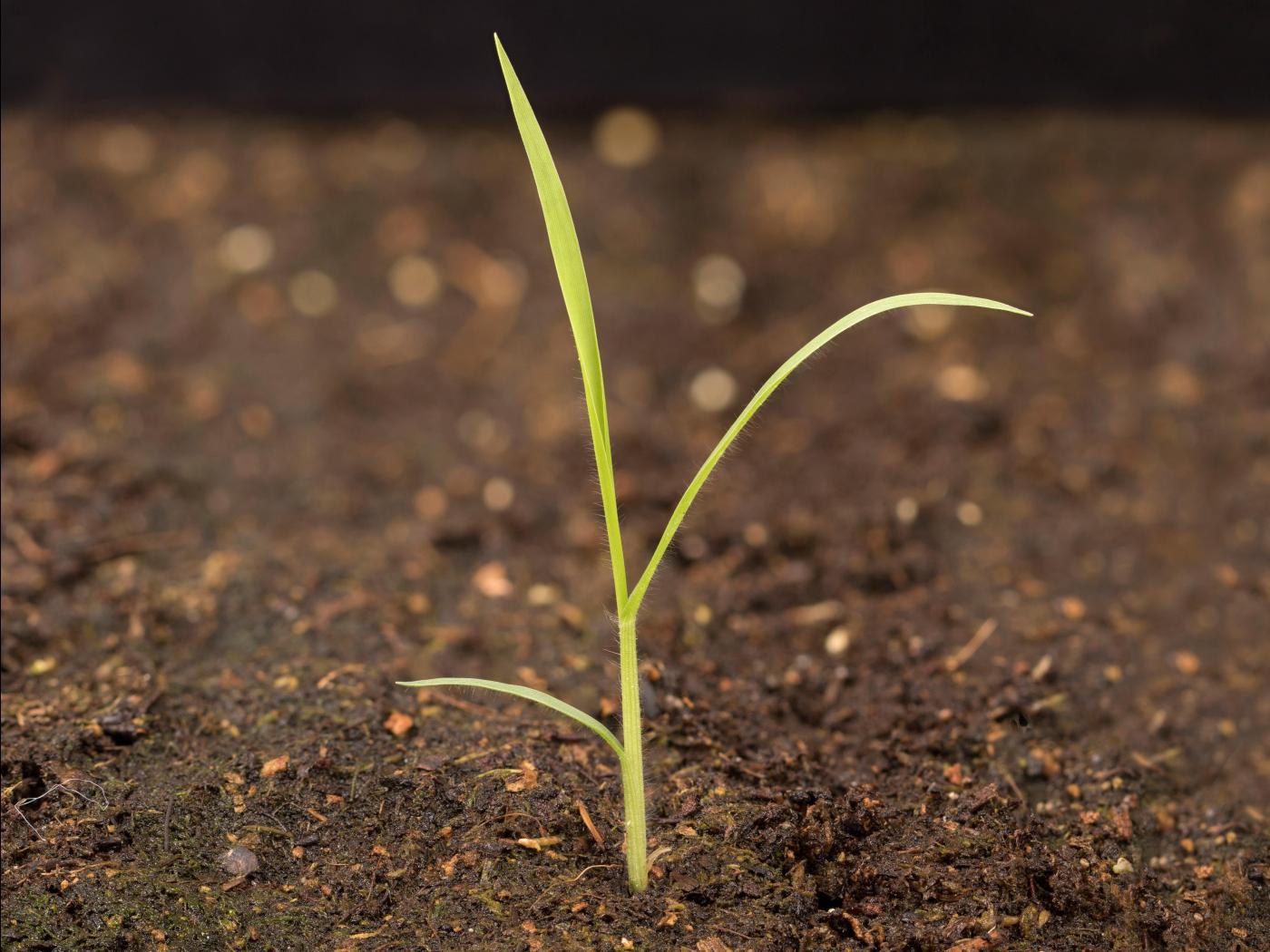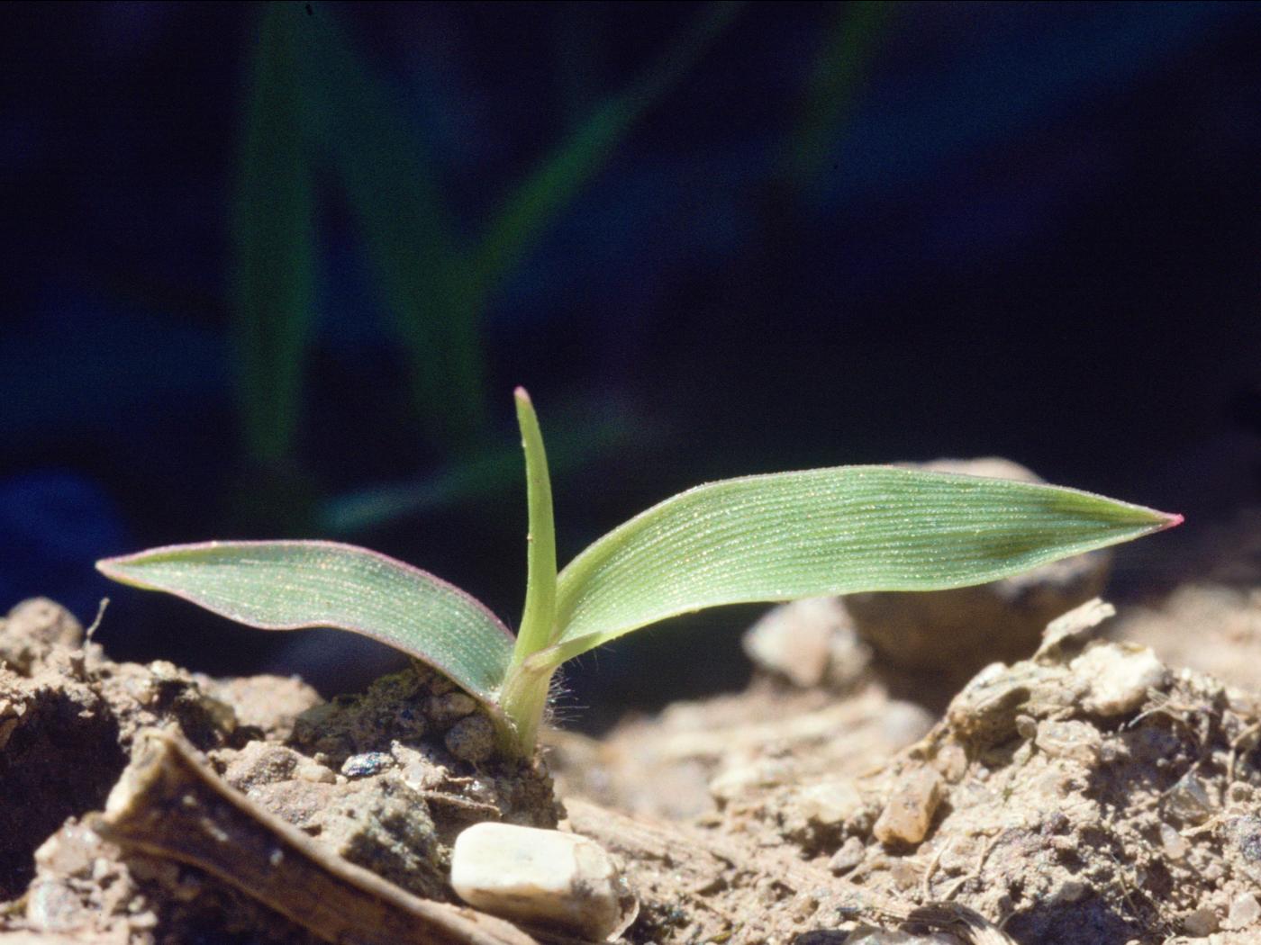 La plantule est velue sur la gaine et le limbe des premières feuilles. Le limbe est moins élargi à la base que les autres espèces du genre Panicum. La ligule est visible à partir de la 3e feuille. Elle est caractérisée par une rangée de poils qui sont collés sur la moitié de leur longueur. La gaine est à section arrondie à ovale et les nouvelles feuilles apparaissent enroulées sur elles-mêmes.