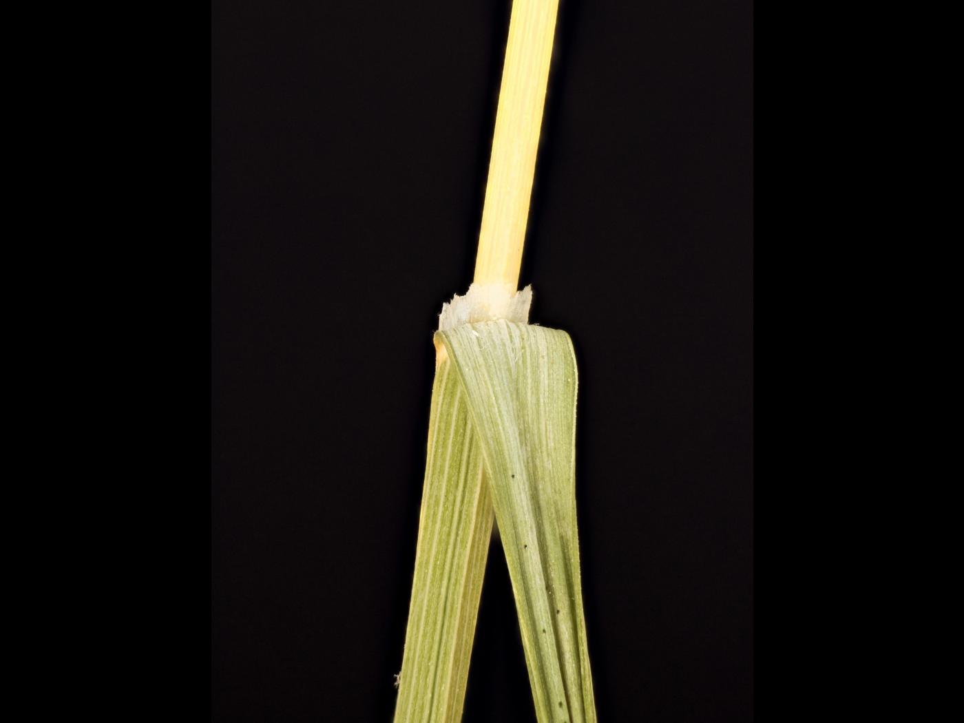 Les feuilles sont de couleur bleutée ou vert mat. Le limbe mesure de 10 à 30 cm de longueur et de 2 à 4,5 mm de largeur. Les feuilles se terminent en pointe de canot (les côtés sont partiellement soudés et relevés). Elles comprennent des stries perpendiculaires aux nervures vers le centre du limbe, leur donnant un aspect gaufré. La ligule est membraneuse et mesure 0,5 mm de longueur. La gaine est aplatie et glabre. Les oreillettes sont absentes.