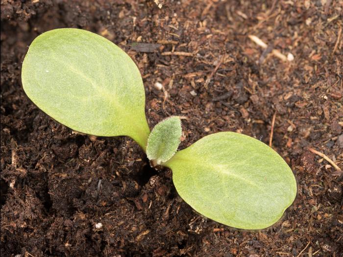 La plantule est une rosette à feuilles alternes. Les cotylédons sont charnus, de forme oblongue et mesurent de 15 à 25 mm de longueur. La nervure médiane est bien visible sur la face inférieure. Les premières feuilles sont entières à sinuées, arrondies à ovales, avec la base atténuée. Elles sont pubescentes sur la face inférieure et sont portées par un pétiole distinct.