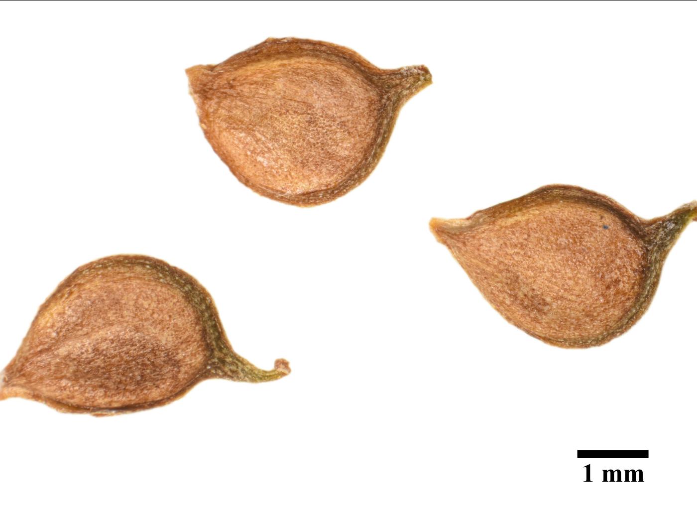 Les fruits sont des akènes réunis en masse globuleuse de 6 à 7 mm de diamètre. Les akènes sont aplatis et prolongés d’un bec en forme de crochet qui mesure de 0,8 à 1,2 mm de longueur. Ils mesurent de 2,6 à 3,2 mm de longueur et de 2 à 2,8 mm de largeur. Leur surface est glabre et de couleur brun pâle à foncé.