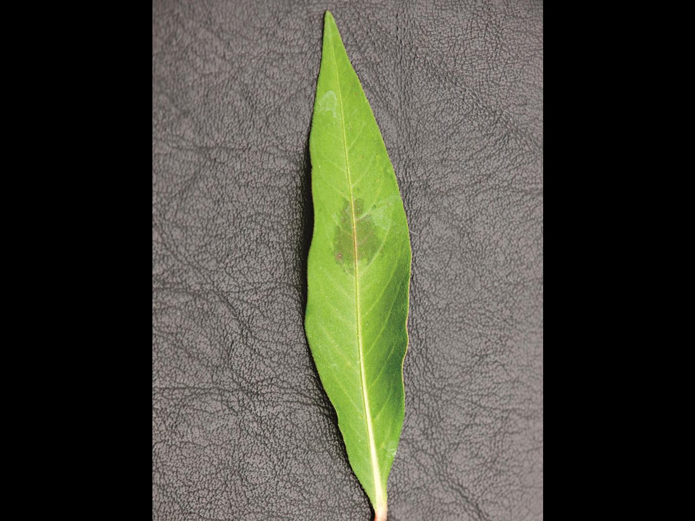Les feuilles sont allongées et à marge entière. Elles mesurent de 5 à 10 cm de longueur et de 1,2 à 5 cm de largeur. Le limbe est glabre et souvent marqué d'une tache noirâtre de forme triangulaire au centre. Le pétiole est glabre ou parfois pubescent et mesure de 1 à 8 mm, les feuilles sont parfois sessiles. Un ochréa est présent à la base du pétiole et entoure la tige à chaque nœud. Il est pubescent et mesure de 4 à 10 mm de longueur. La marge est tronquée et ciliée au sommet.