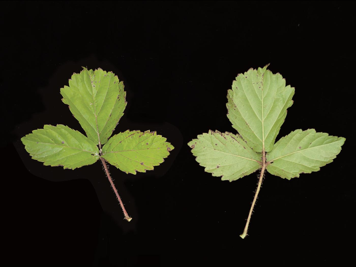 Les feuilles sont alternes sur la tige et toutes composées de 3 folioles. Les folioles sont de forme ovée plus large près du sommet et mesurent de 1,7 à 6,5 cm de longueur et de 1 à 5,2 cm de largeur. La base du limbe est cordée à arrondie, la marge est dentée et l’apex est acuminé à arrondi. La face supérieure des folioles est verte, glabre et lustrée, la face inférieure est blanchâtre et parfois, un peu pubescente. La foliole terminale est portée par un petit pétiole, les autres sont sessiles. Des stipules sont présentes sur la tige, à la base des feuilles. Elles sont de forme linéaire à lancéolée et mesurent de 5 à 15 mm de longueur.