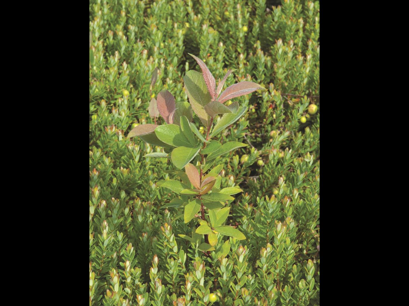 Les jeunes rameaux sont brun rougeâtre ou jaunâtre, glabres et lustrés. Les jeunes feuilles sont généralement translucides et glabres, mais peuvent avoir une légère pilosité blanche sur la face abaxiale.
