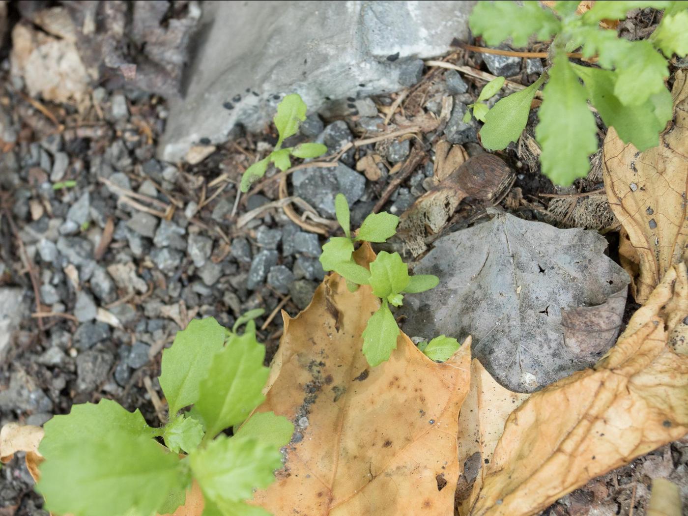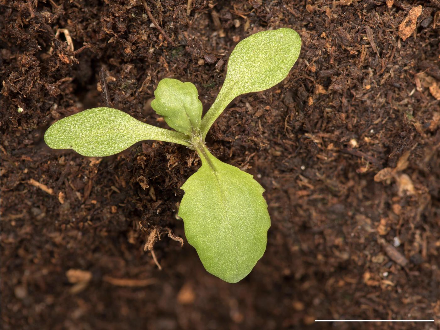 La plantule a une tige très courte qui lui confère l’allure d’une rosette. Les cotylédons, de forme oblongue à allongée, mesurent de 9 à 12 mm de long par 2 à 3 mm de large et sont munis d’un pétiole mesurant de 2 à 3 mm. Les premières feuilles sont alternes, vertes et pourvues d’une coloration violacée sur les nervures ou le dessous des feuilles. Elles ont un limbe elliptique et denté. Une pilosité laineuse recouvre les jeunes feuilles et disparaît au fur et à mesure de leur croissance.