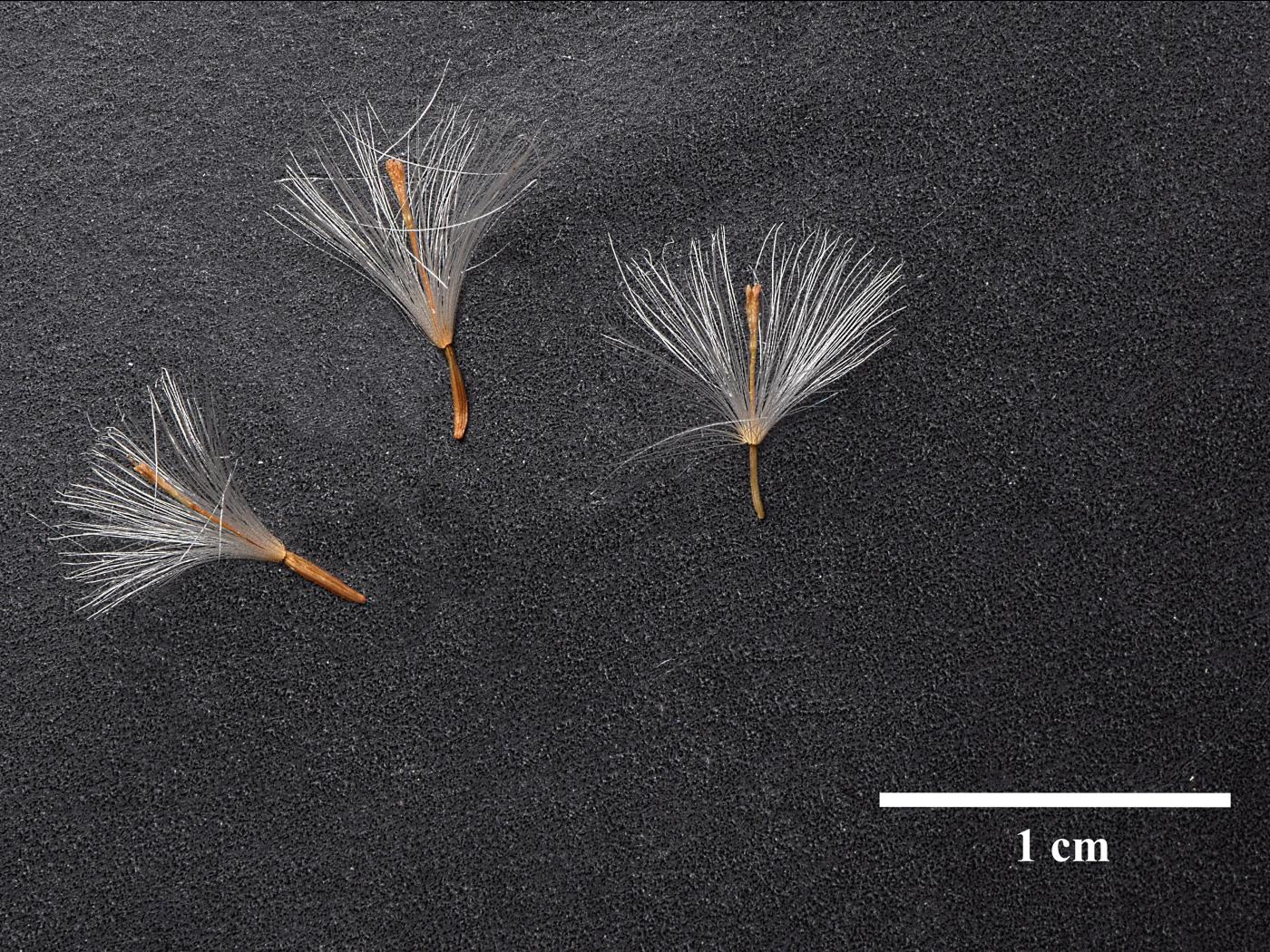 Le fruit est un akène attaché à des aigrettes blanches, ce qui lui permet de se disperser efficacement grâce au vent. Les akènes sont de forme circulaire, comprennent de 5 à 10 nervures et sont recouverts de poils raides.