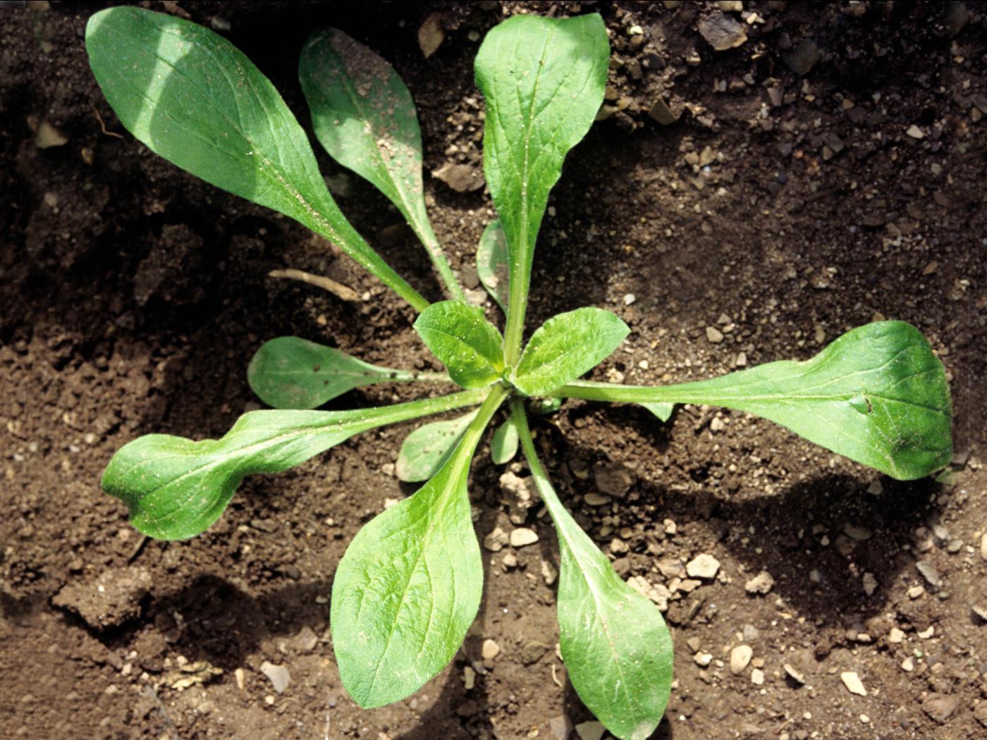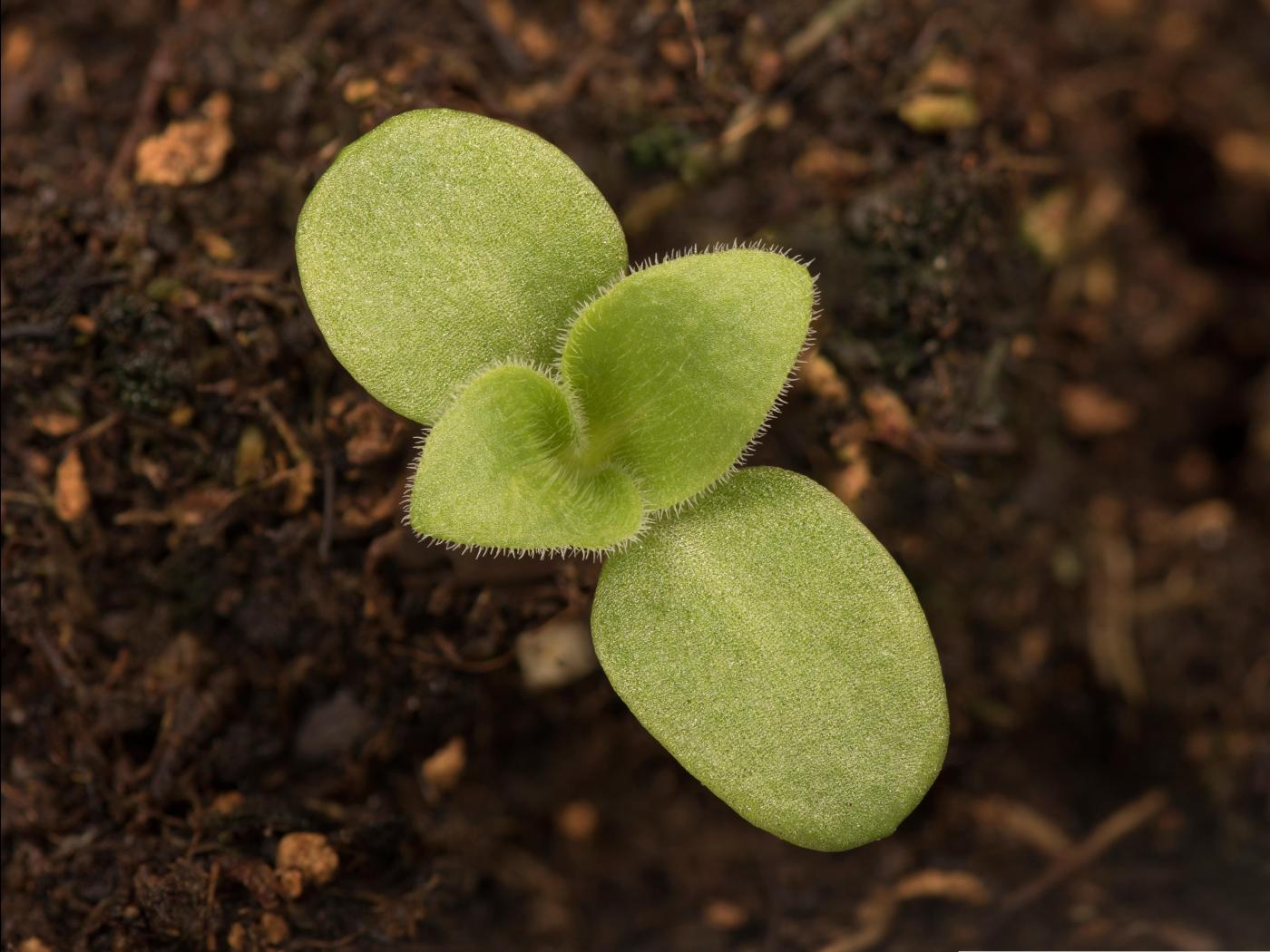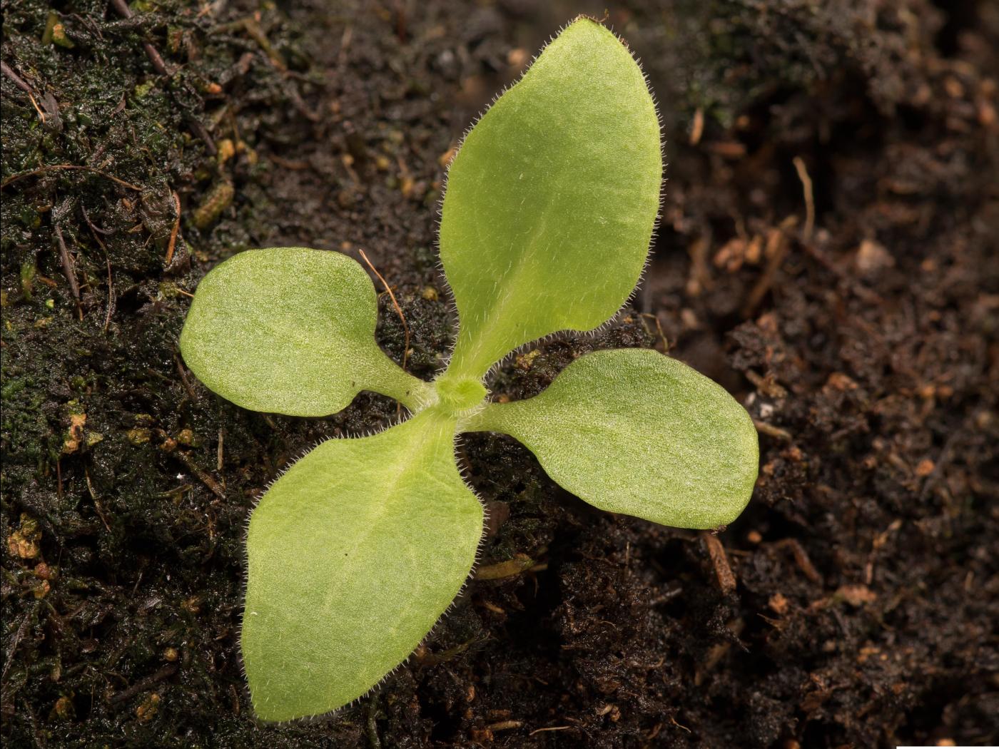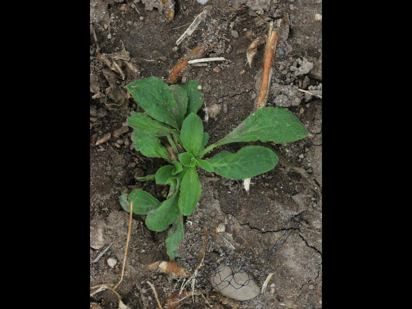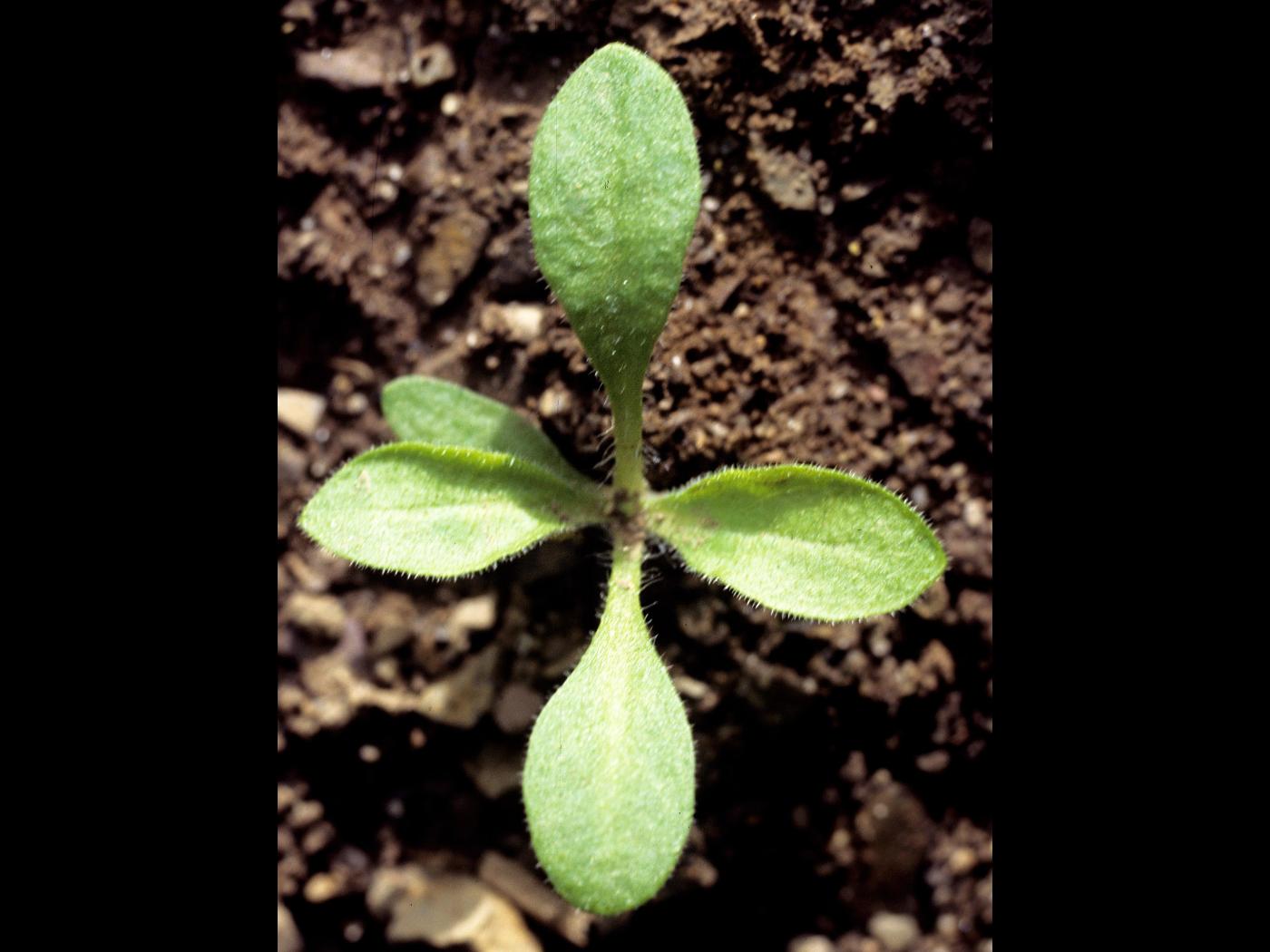 La plantule est à rosette et à feuilles opposées. Les cotylédons sont de forme oblongue à allongée, ils sont charnus et glabres. Ils mesurent de 10 à 15 mm de longueur. Les premières feuilles sont à marge entière, de forme arrondie à ovale et terminées par une petite pointe. Elles sont pubescentes et présentent de longs poils sur le bord du limbe.