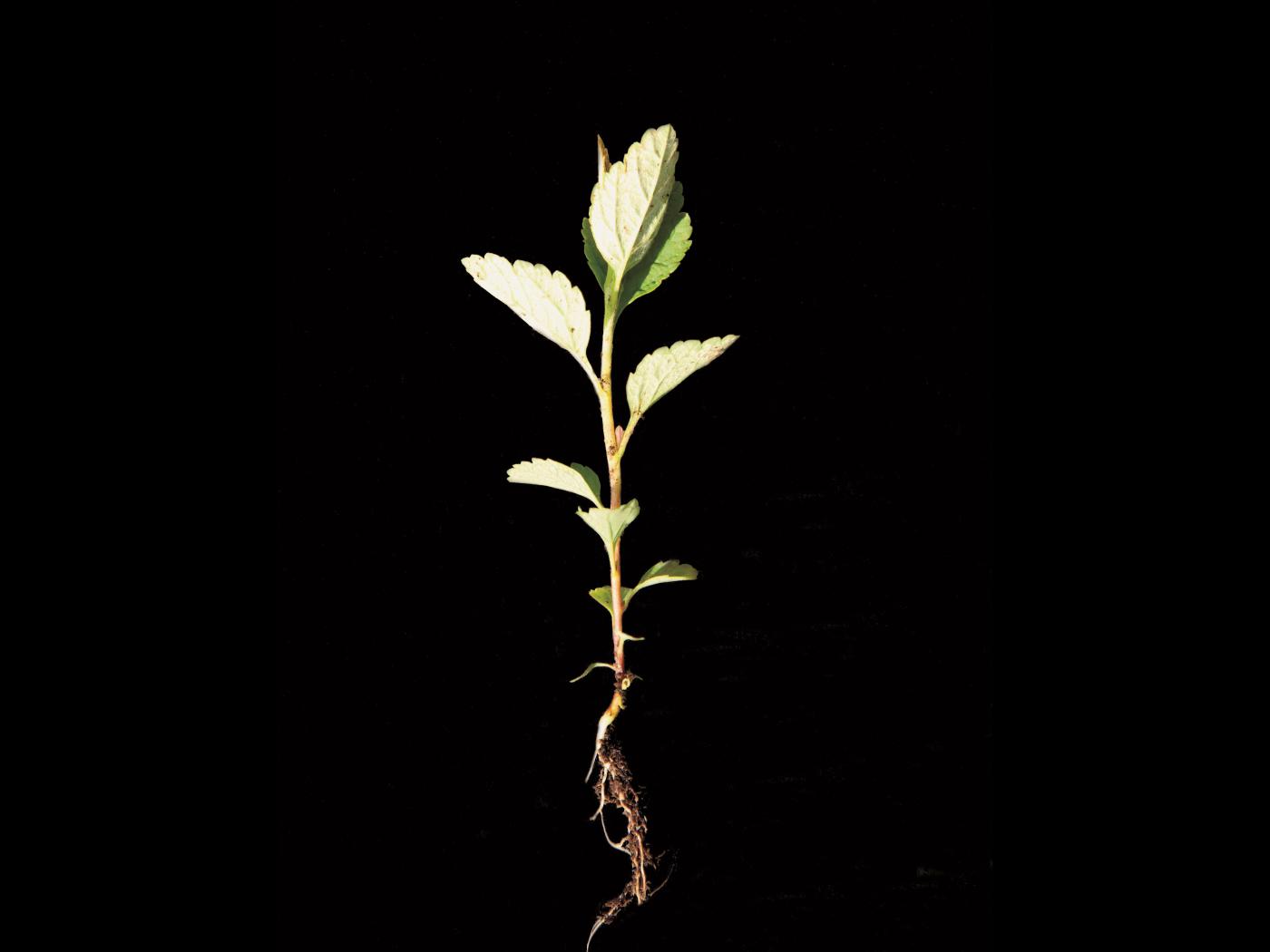 Les feuilles sont alternes et portées par un pétiole mesurant moins de 3 mm de longueur. Elles sont de forme elliptique, rétrécissant graduellement à la base et à marge dentée. La face inférieure est vert pâle et tomenteuse tandis que la face supérieure est vert foncé et glabre. Elles présentent des nervures pennées proéminentes.