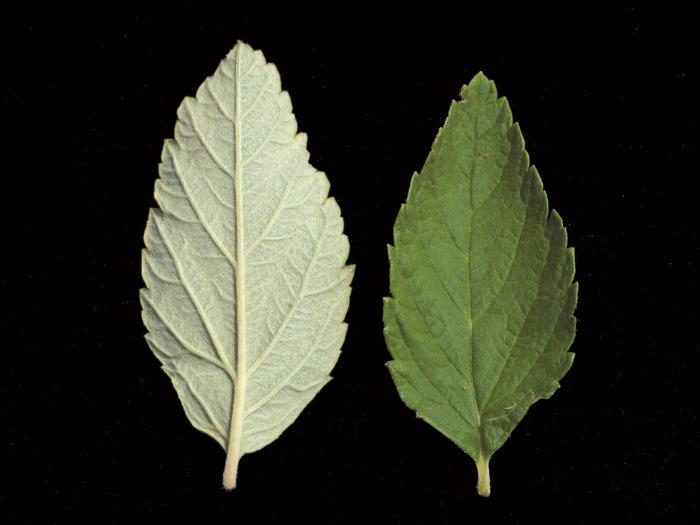 Les feuilles sont alternes et portées par un pétiole mesurant moins de 3 mm de longueur. Elles sont de forme elliptique, rétrécissant graduellement à la base et à marge dentée. La face inférieure est vert pâle et tomenteuse tandis que la face supérieure est vert foncé et glabre. Elles présentent des nervures pennées proéminentes.