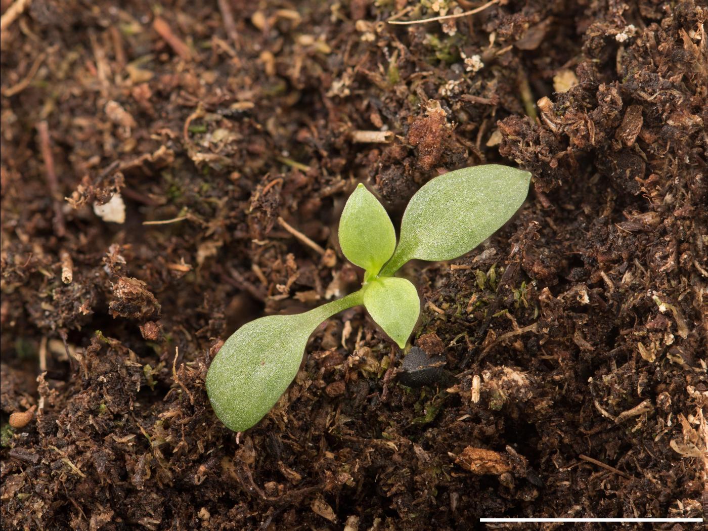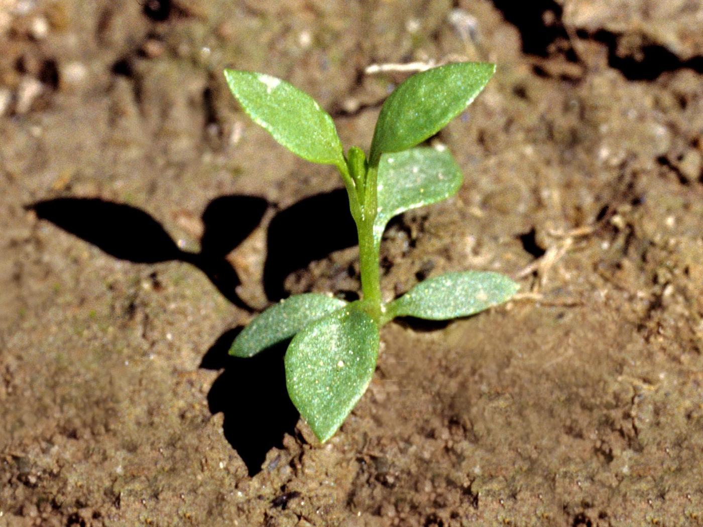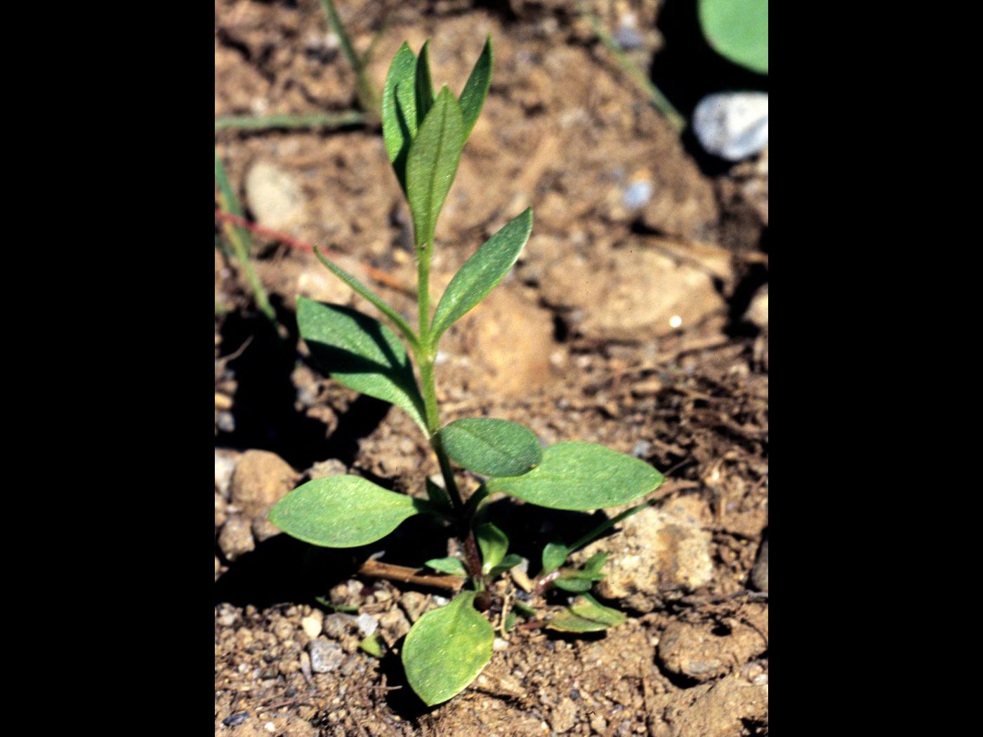 La plantule est à tige et à feuilles opposées. Les cotylédons sont de forme oblongue à allongée avec un sommet en pointe. Ils mesurent de 5 à 10 mm de longueur. Les premières feuilles sont entières, ovales et terminées en pointe. Elles ressemblent aux cotylédons. Des pousses végétatives proviennent des tiges couchées sur le sol dont les nœuds se sont enracinés.