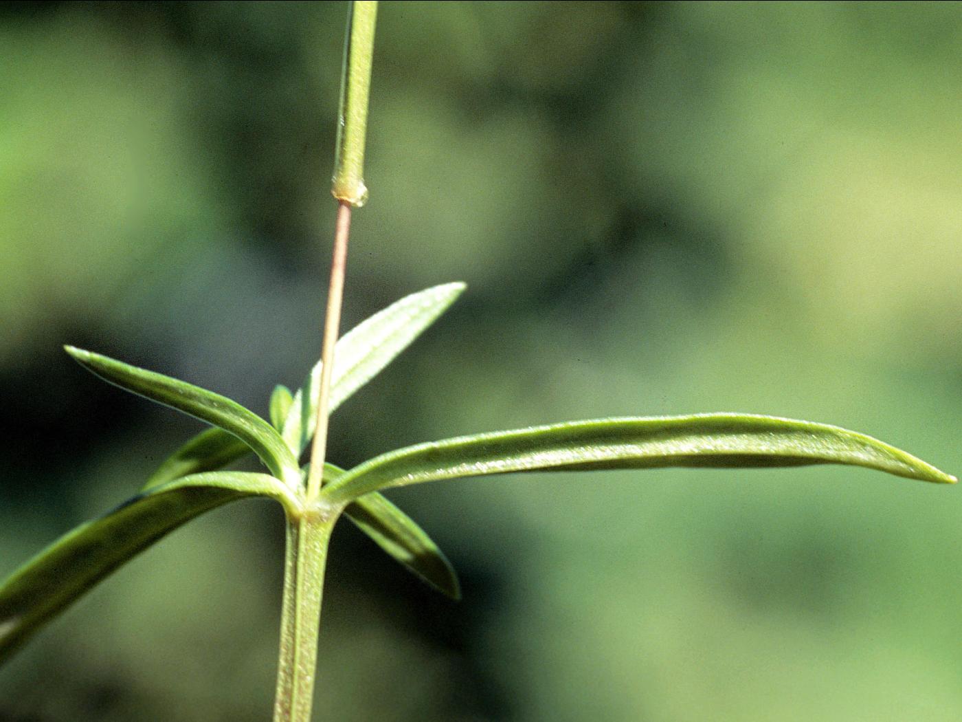 Les feuilles sont opposées et étroites, rappelant celles des graminées. Elles mesurent de 1,5 à 4 cm de longueur et de 0,1 à 0,6 cm de largeur. Elles sont de forme allongée, terminées en pointe avec une marge entière et une nervure centrale bien apparente. La base des feuilles est plus large, arrondie. Les feuilles sont glabres et sessiles.