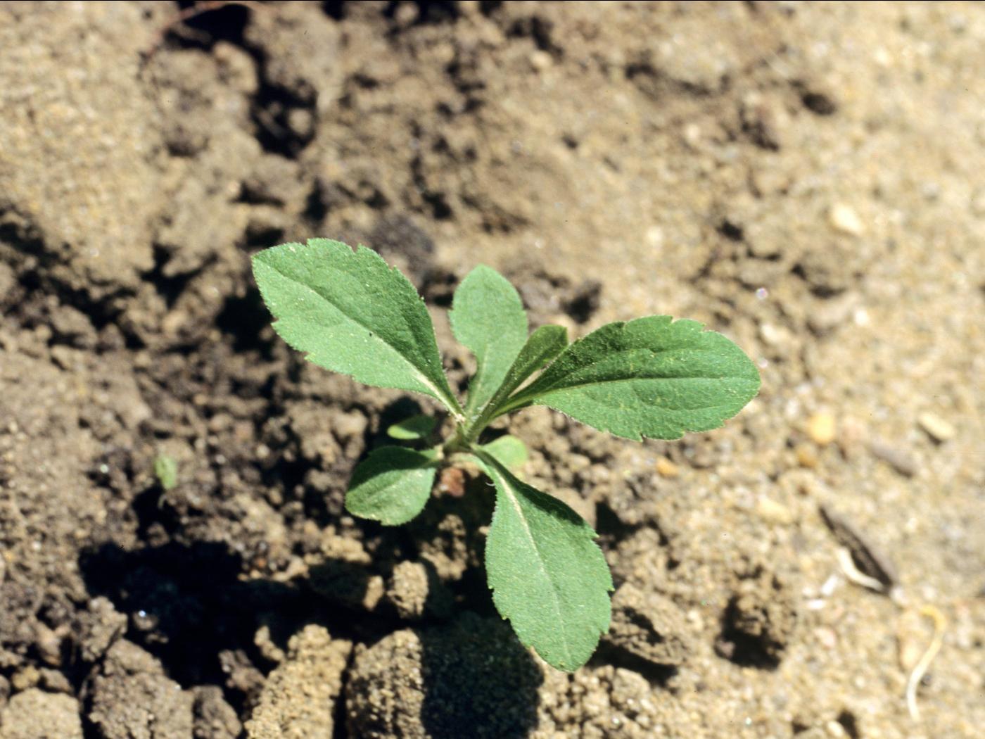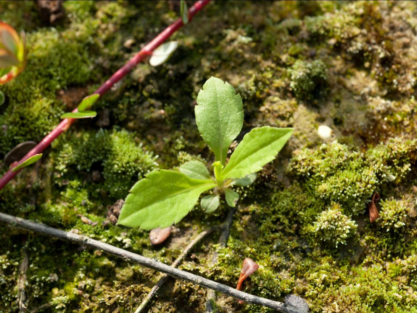 La plantule est composée de feuilles alternes qui forment une rosette. Les cotylédons sont de forme oblongue et mesurent de 1,5 à 2,5 mm de longueur. Les premières feuilles sont pubescentes, de forme arrondie à ovale, le bord du limbe porte de 1 à 2 encoches ou quelques dents grossières. Les cotylédons se dessèchent rapidement après l’apparition des feuilles.