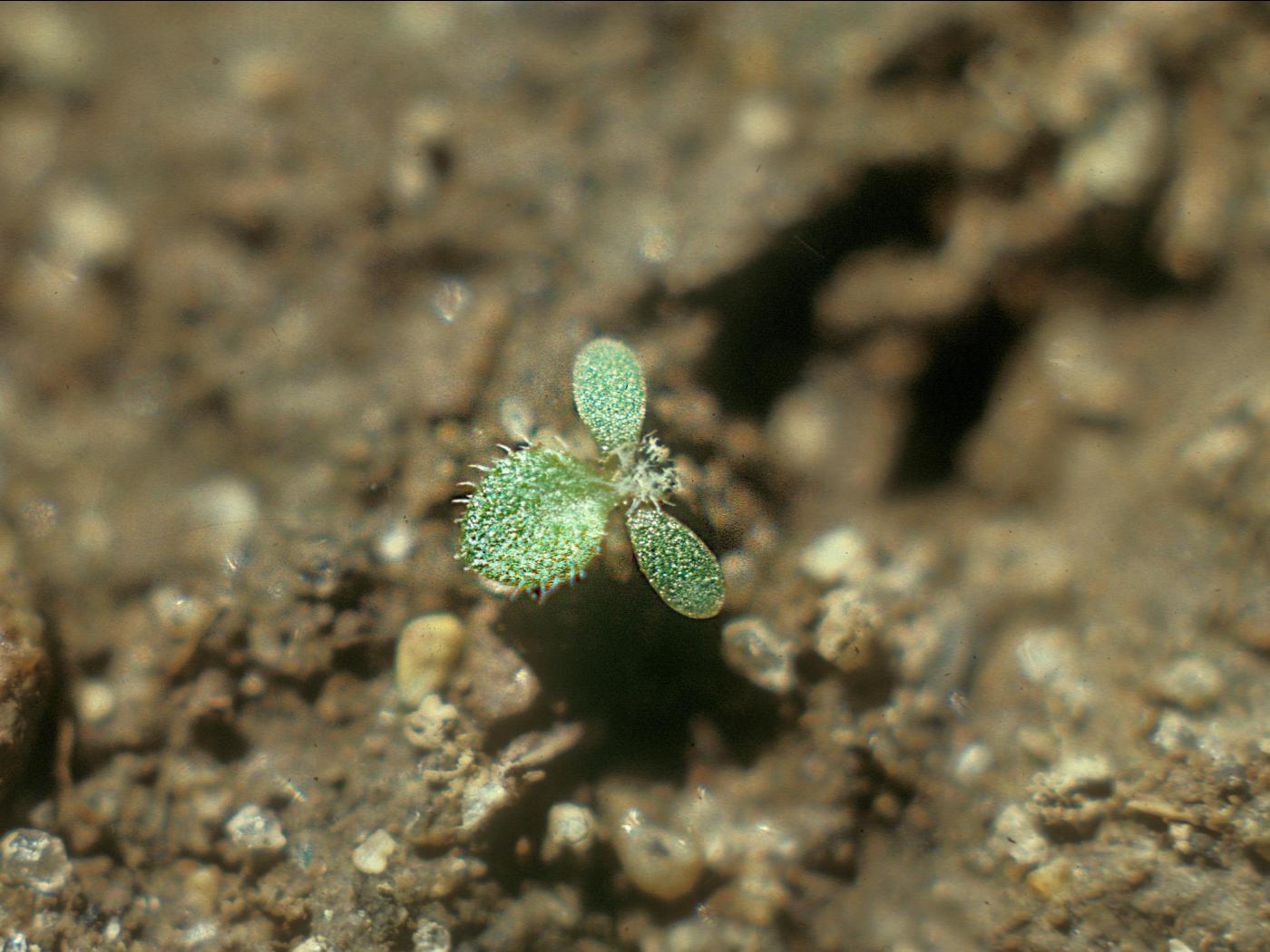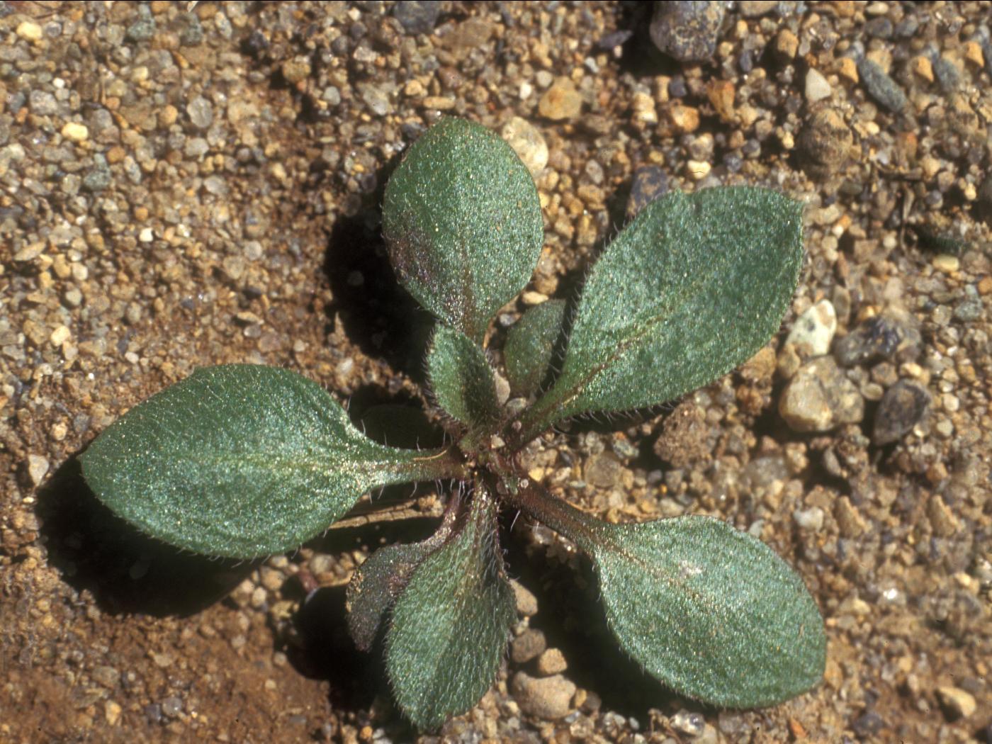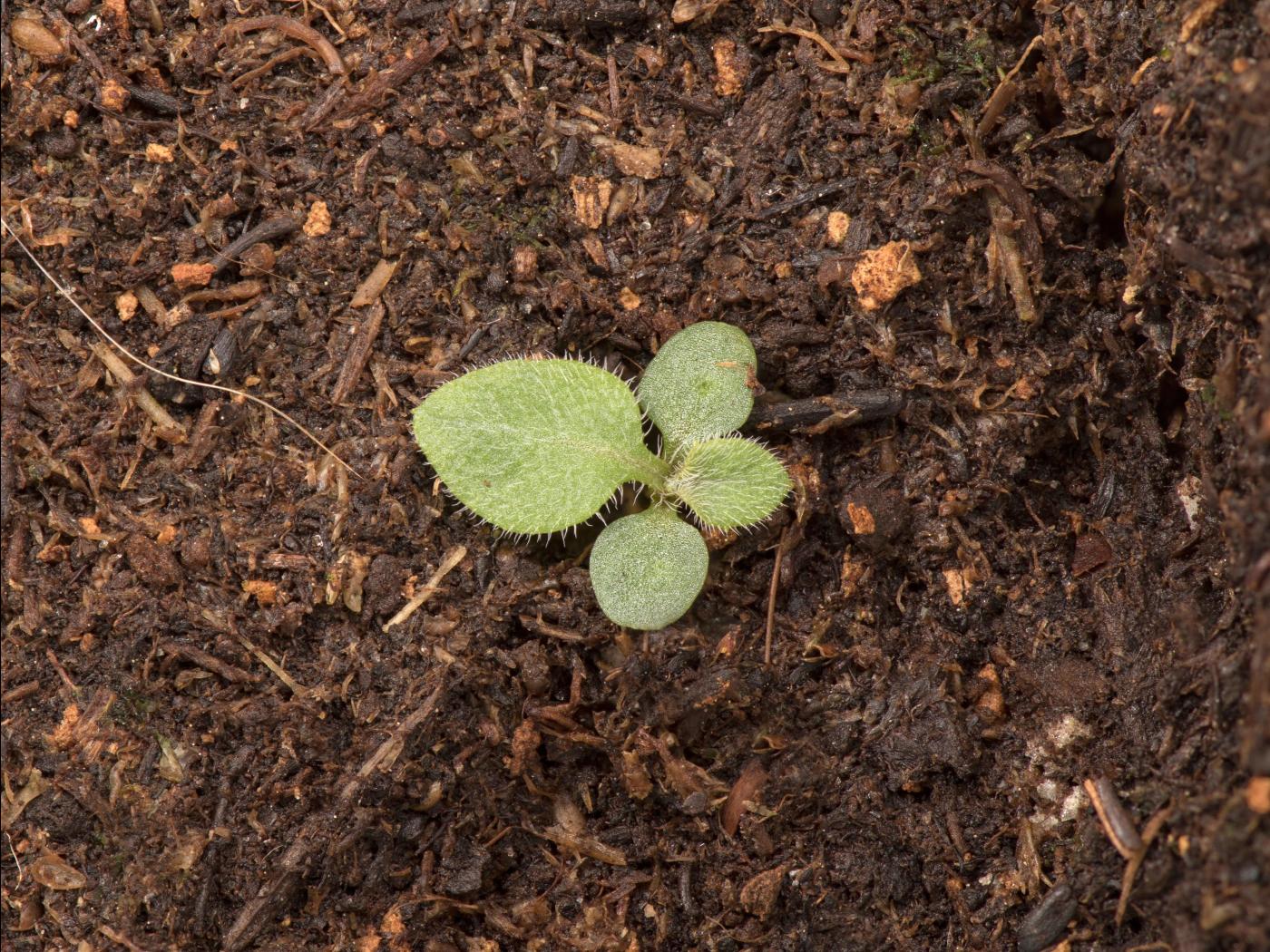 La plantule est à feuilles alternes et forme une rosette. Les cotylédons sont de forme oblongue, très petits et mesurent de 2 à 3 mm de longueur. Ils ont un sommet arrondi et un pétiole court. Les premières feuilles sont entières, de forme arrondie à ovale, très pubescentes avec des poils dressés et blanchâtres.