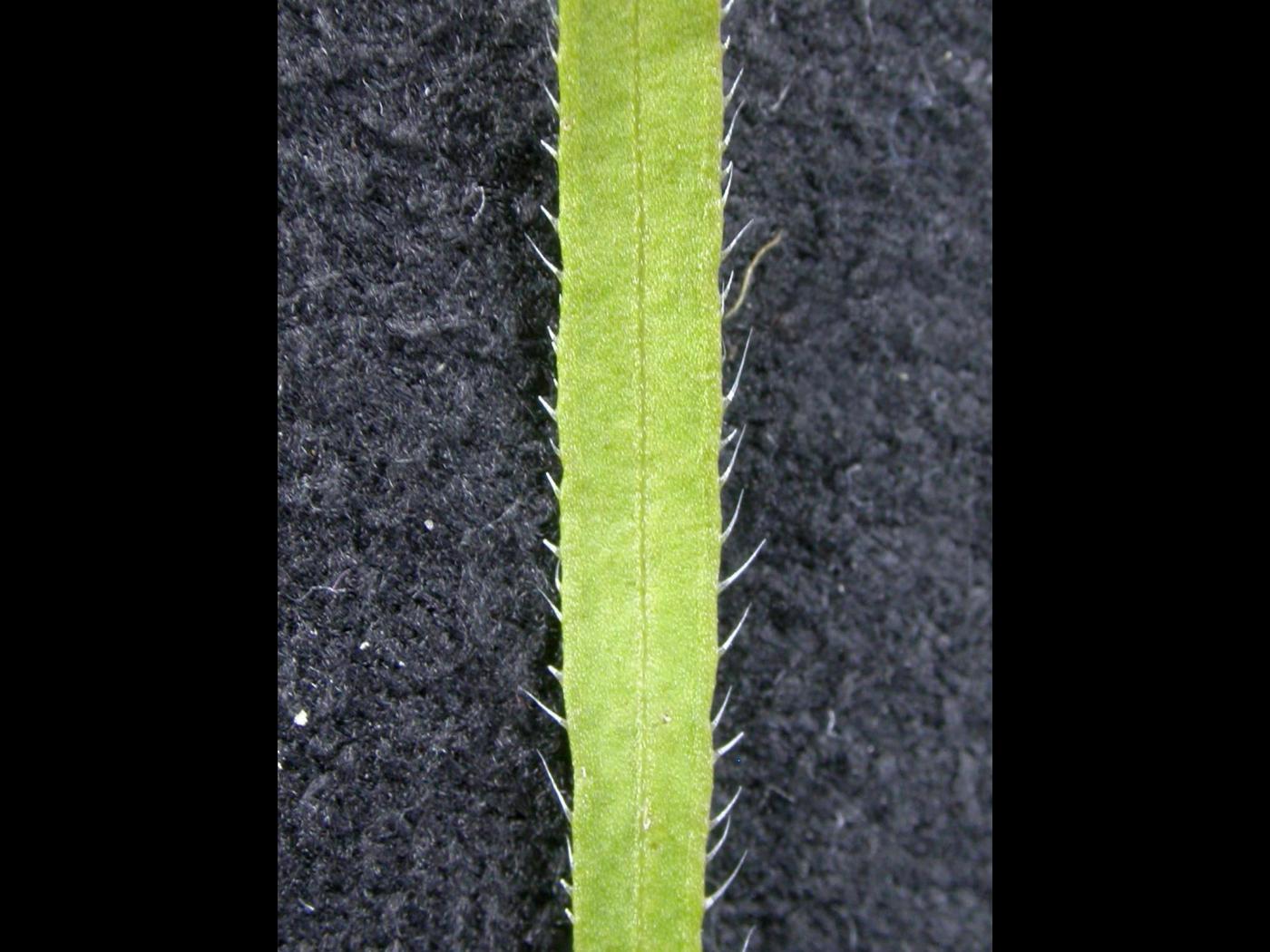 Les feuilles sont alternes et nombreuses. Elles mesurent jusqu’à 12 cm de longueur et 1 cm de largeur. Elles sont de formes variables dépendamment de leur emplacement sur la plante, mais sont toujours terminées en pointe. Celles de la rosette mature (basales) ont quelques grosses dents sur la marge, elles sont de forme oblongue à lancéolée, allongée et très pubescentes avec des poils soyeux. Ces feuilles se dessèchent souvent à maturité et ont un pétiole plus ou moins distinct. Celles du haut de la tige (caulinaires) sont de plus petite taille et sont plus étroites. La marge est entière et le limbe s’atténue en pétiole. De longs cils dressés bordent la partie inférieure des feuilles caulinaires. Elles sont d'une teinte vert mat en saison et prennent une teinte vert pâle à la floraison.