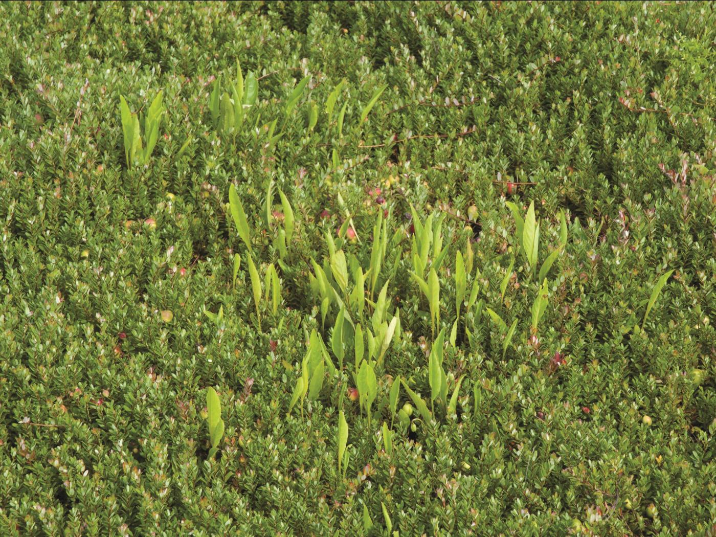 Légende: Plant, stade floraison, dans un champ de canneberges