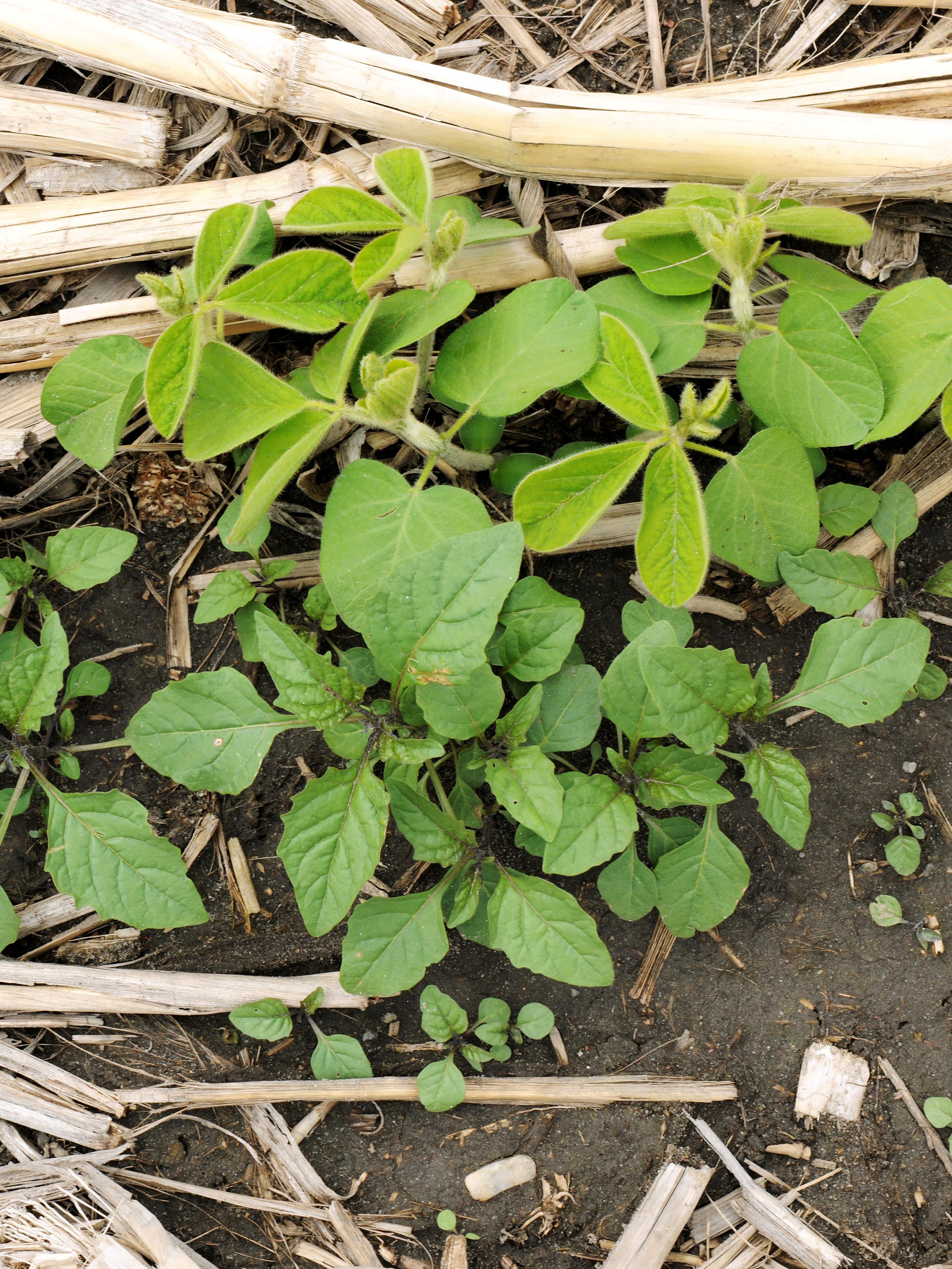 Plantules à différents stades, entre les rangs de soya en semis direct