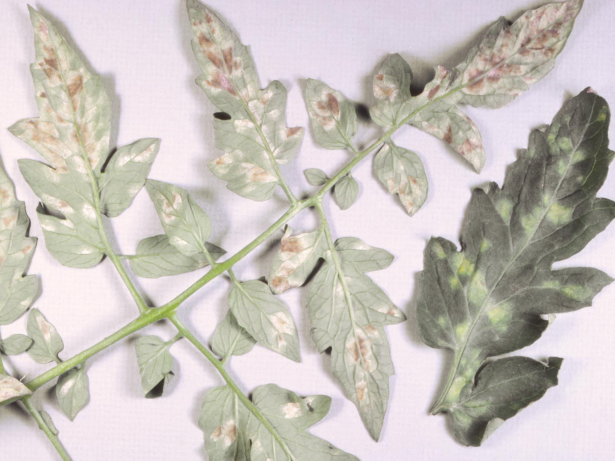 Taches jaunes ou blanches et mycélium brun sur feuille de tomate