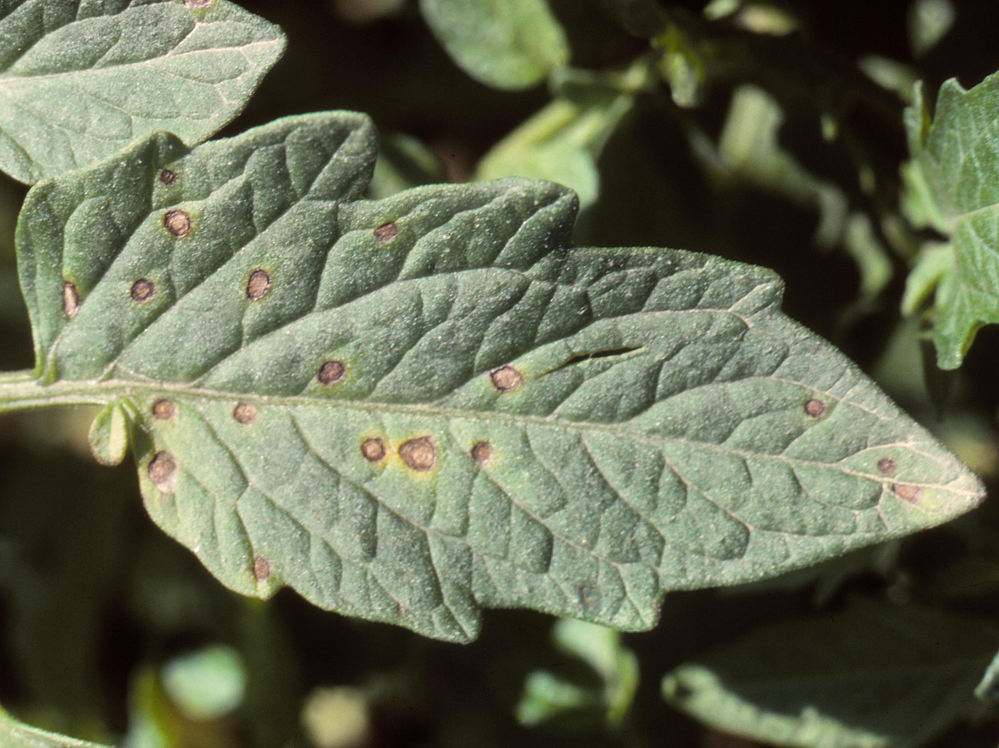 Une foliole de tomate de champ montre de petites taches circulaires brun pâle avec une marge foncée, parfois entourées d’un halo jaune. Les observations microscopiques ont révélé la présence du champignon Septoria lycopersici, responsable de la tache septorienne chez la tomate.