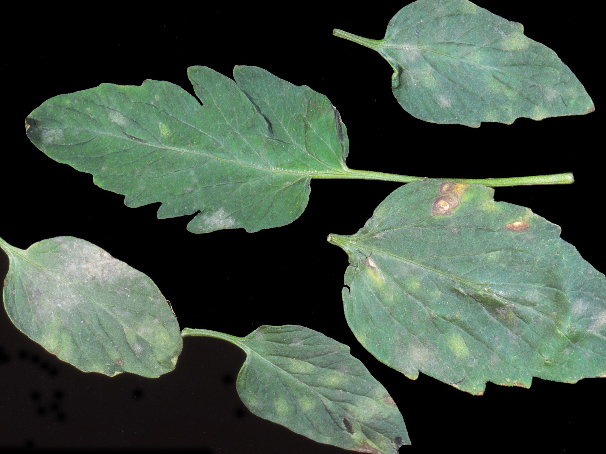 À la face supérieure des folioles de tomate de serre, présence de taches circulaires couvertes d’un duvet blanchâtre et de taches vert pâle à jaune pâle. Parfois les taches blanches s’unissent pour forme de larges plages blanches teintées de rose. Les observations microscopiques ont révélé la présence de spores du champignon Oidium neolycopersici, responsable du blanc chez la tomate.